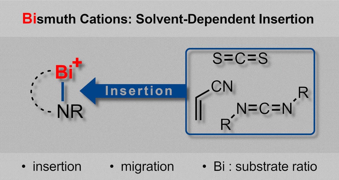 Wie beeinflusst die Wahl des Lösungsmittels die Reaktivität? Die Reaktion von aktivierten Doppelbindungen mit kationischen Bismutamiden wurde untersucht. Abhängig von der Wahl des Lösungsmittels wird die erwartbare Insertionsreaktion beobachtet, oder aber eine Inersertion gefolgt von ungewöhnlichen Arylmigrationsreaktionen. Auch die Reaktivität gegenüber wichtigen Grundchemikalien wie Acrylnitril lässt sich so steuern. Die beobachteten Unterschiede werden unter anderem auf das lösungsmittelabhängige Aggregationsverhalten der Verbindungen zurückgeführt. Die Arbeit wurde zur Publikation in Organometallics angenommen - herzlichen Glückwunsch an alle Beteiligten!
