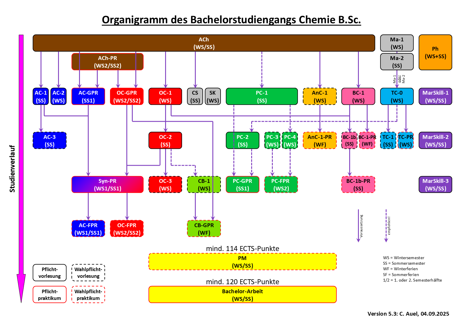 Nachfolgend finden Sie Empfehlungen zur zeitlichen Anordnung der Module während Ihres Studiums. Seit dem Wintersemester 2025/2026 haben wir für Sie zusätzlich zu den exemplarischen Studienverlaufsplänen sogenannte Organigramme erstellt. Wir beraten Sie gerne zur Struktur Ihres Studiums- melden Sie sich gerne via Mail und vereinaren einen Termin (Studienberatung).