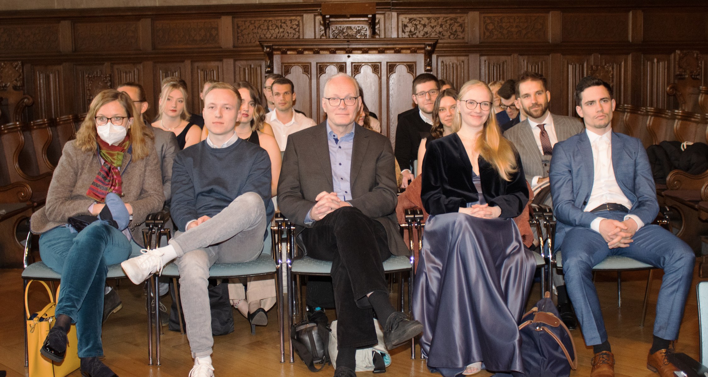 Die Moderation und Eröffnungsrede wurden vom Dekan des Fachbereichs Pharmazie Prof. Dr. Michael Keusgen sowie vom Prodekan Prof. Dr. Carsten Culmsee übernommen. Sie begrüßten die rund 70 Absolvent:innen, die allesamt mit ihren Familien und Freunden gekommen waren. Dadurch war die Aula der alten Universität voll besetzt mit festlich gekleideten Menschen, die stolz auf die Leistungen der Absolvent:innen der Pharmazie eine feierliche Stimmung verbreiteten. In den Begrüßungsreden ließen Herr Prof. Keusgen und Herr Prof. Culmsee die Studienzeit der Absolvent:innen Revue passieren und verdeutlichten, was sie bereits alles in acht Semestern Studium geleistet haben. Aber es wurde nicht nur über die Vergangenheit gesprochen, sondern auch ein Ausblick auf die Zukunft gegeben und insbesondere die Rolle als zukünftige Apotheker:innen hervorgehoben.