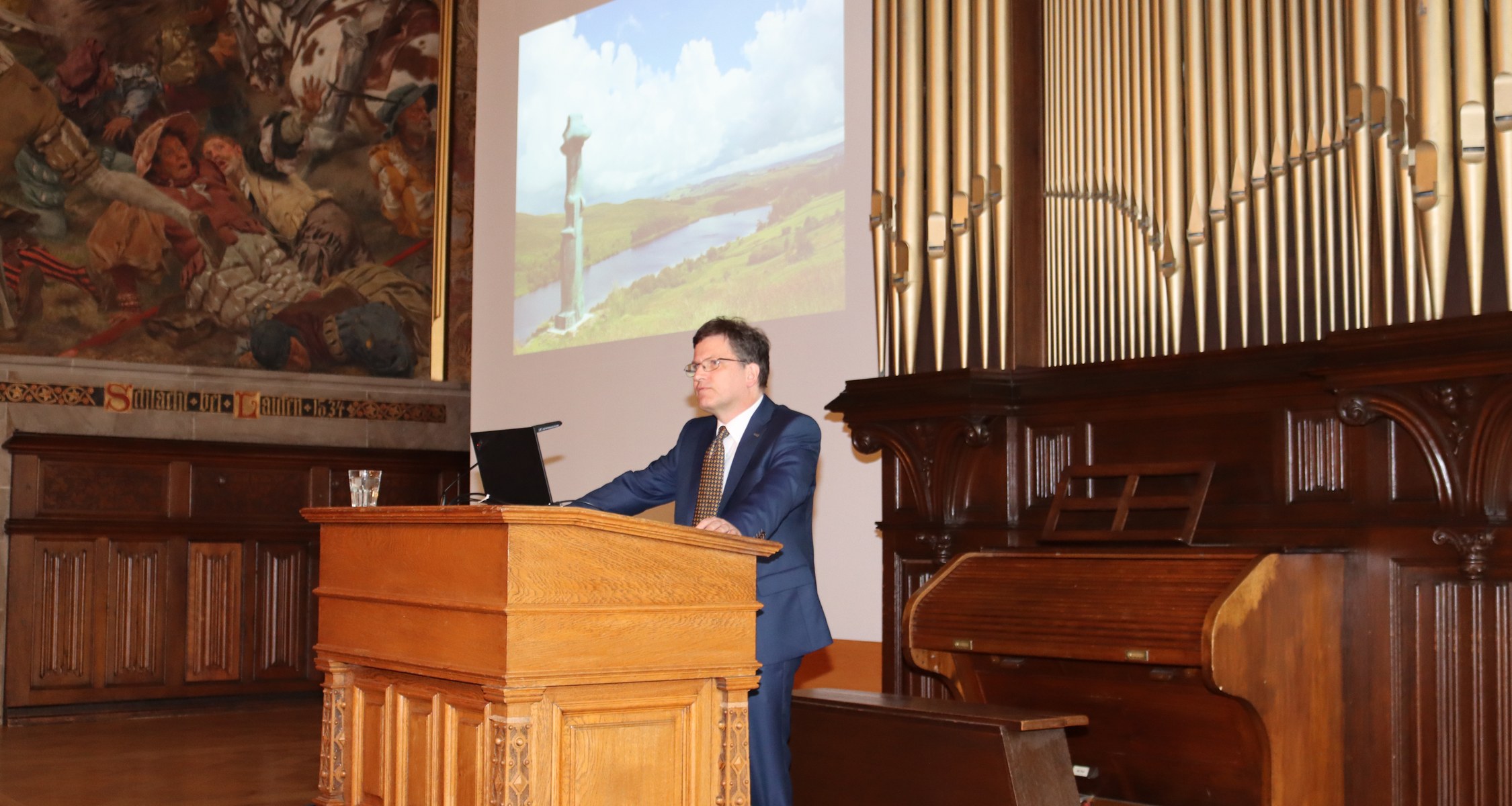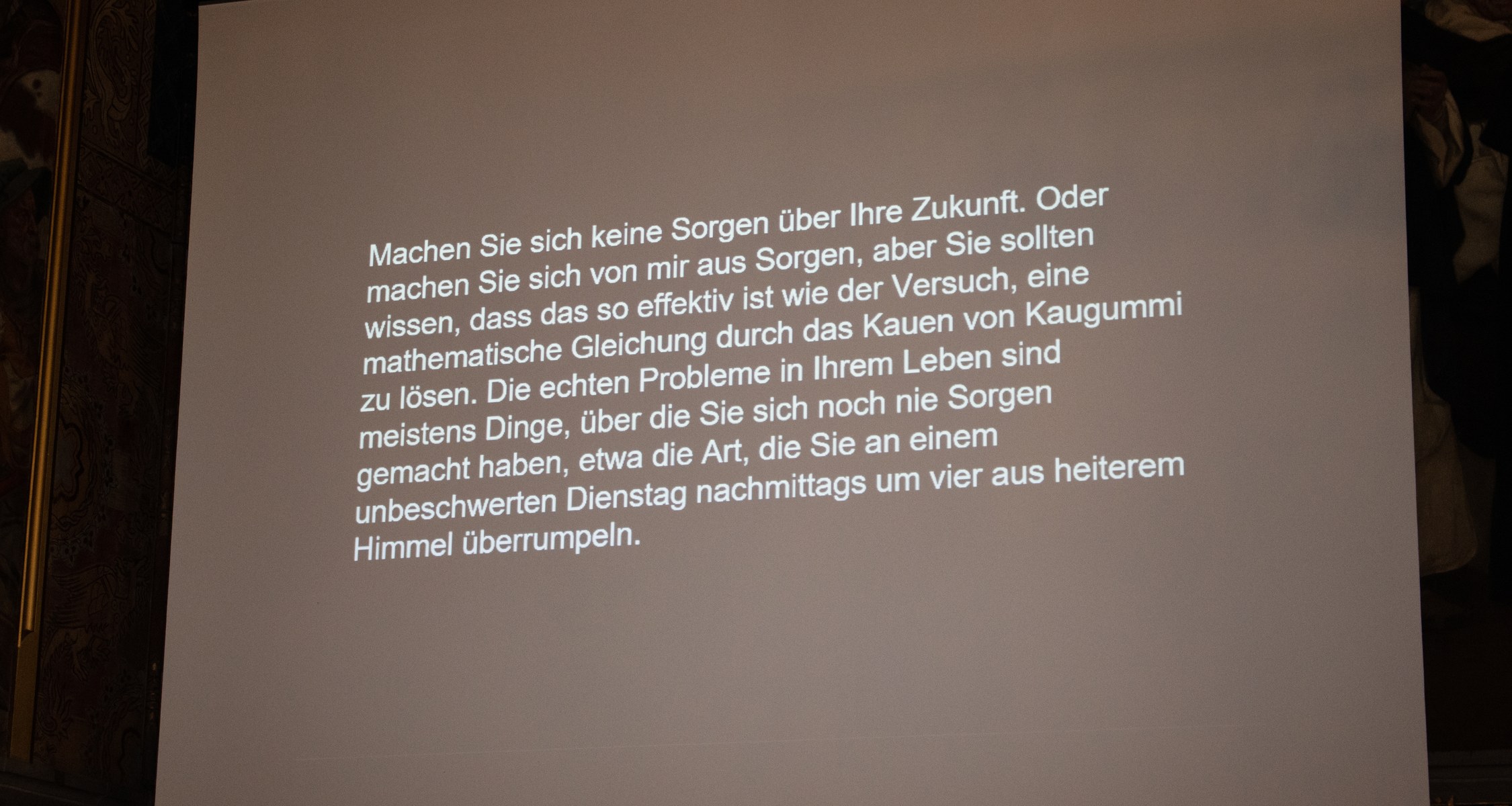 Eine besondere Art der Rede hatte Prof. Dr. Cornelius Krasel vorbereitet, der die Anwesenden nicht mit einem Fachvortrag langweilen wollte sondern kurzerhand von seiner eigenen Abschlussfeier berichtete. Herr Prof. Krasel erzählte, wie er damals bei einem Ausflug nach der Examensfeier das Spoken-Word-Lied „Everybody`s Free (To Wear Sunscreen)” von Baz Luhrmann hörte, was er nun 20 Jahre später im Rahmen der Zeugnisübergabe in Marburg noch einmal zu Gehör brachte. Der Text enthält Lebensweisheiten, die an junge Menschen in Form einer fiktiven Abschlussrede an Universitätsabsolvent:innen weitergegeben werden sollen. Fast jeder im Saal hat nach diesem bewegenden Text mit einem lachenden und einem weinenden Auge der nun folgenden Zeugnisübergabe entgegengeblickt.
