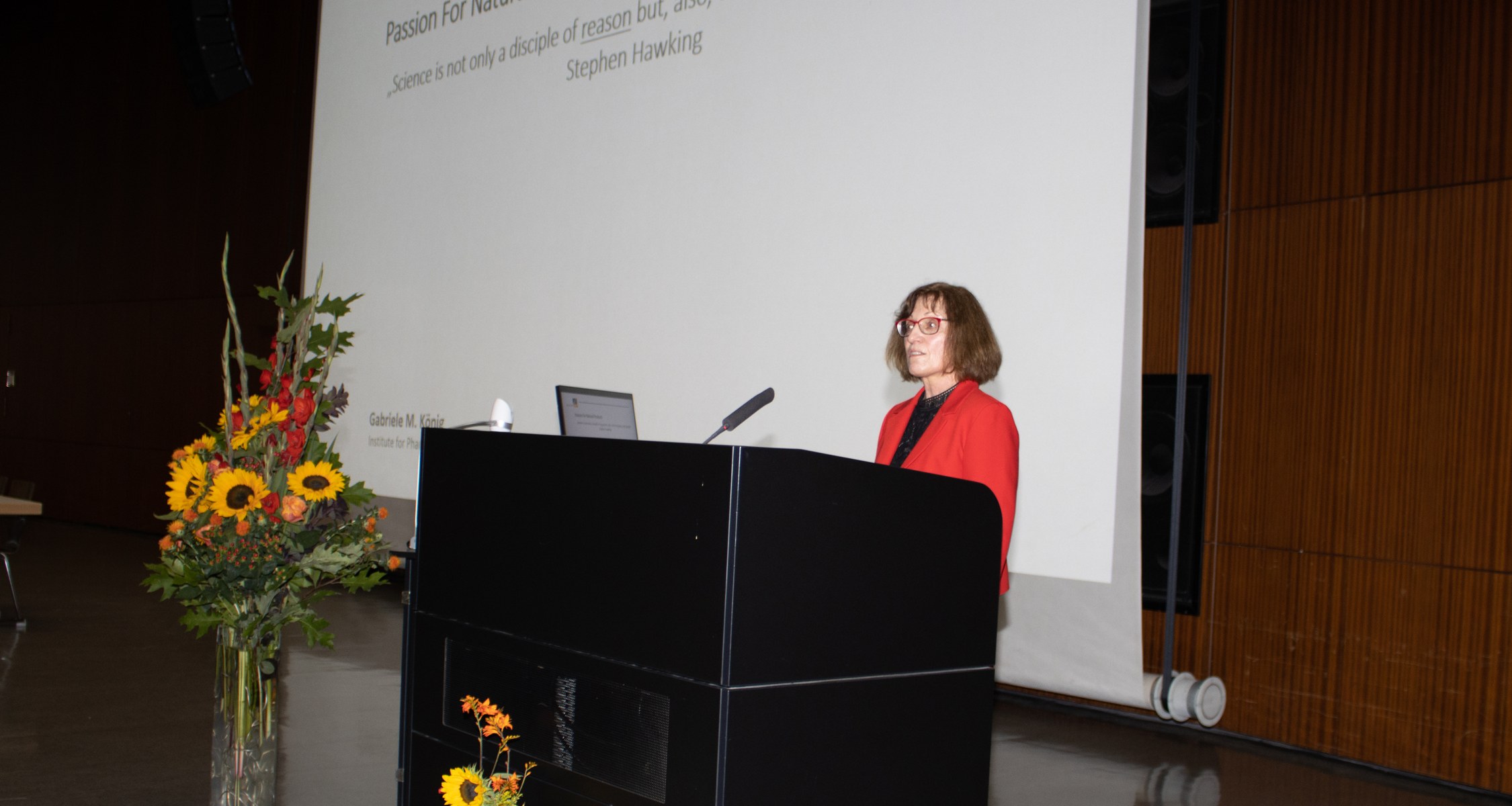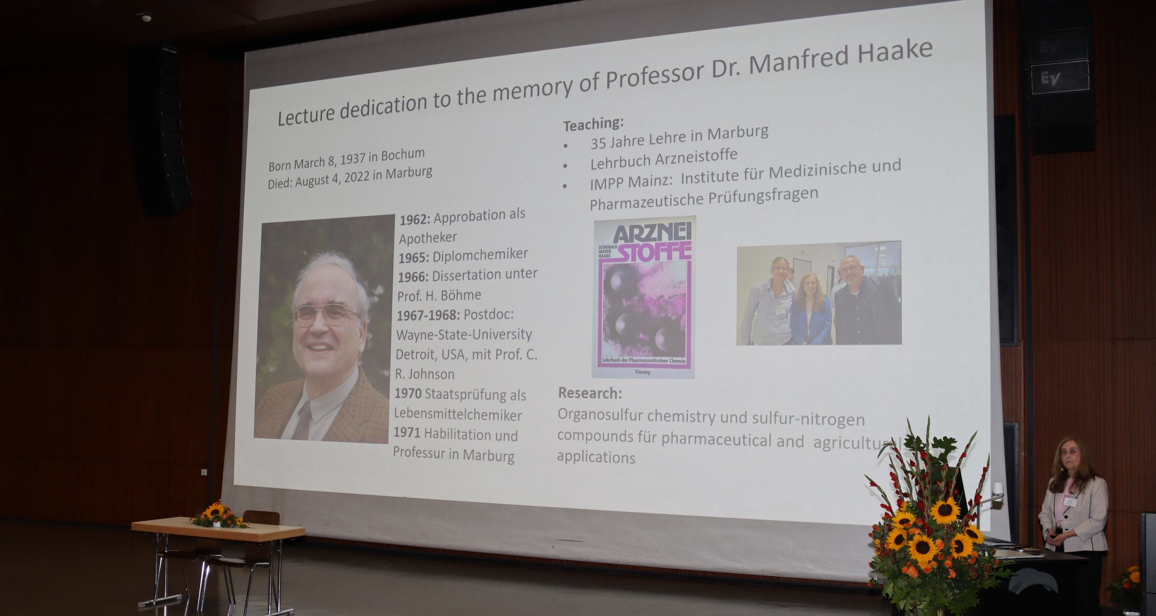 Eindrucksvoll zeigte in einem weiteren Plenarvortrag Prof. Olivia Merkel, LMU München die Möglichkeiten von innovativen RNA-Therapeutika auf, die über die derzeit laufenden Impfkampagnen hinausgehen und mit Hilfe von Nanotechnologie zukünftig auch für Anwendungen bei Tumorerkrankungen, zur gezielten Beeinflussung von Immunzellen sowie bei Infektionserkrankungen weiterentwickelt werden. Prof. Rolf Müller vom Helmholz Institut für Pharmazeutische Forschung im Saarland stellte ganz neue Ansätze zur Entwicklung neuer Anti-Infektiva vor. Er hat sich mit seiner Forschung und in enger Zusammenarbeit mit dem Deutschen Zentrum für Infektionsforschung der Bekämpfung der weltweit weiter zunehmenden Resistenzlage von Bakterien verschrieben und hier beachtliche Erfolge erzielt. Auf der Tagung stellte er die neuesten Ergebnisse und Technologien zur Identifizierung, Optimierung und Produktion neuer und effektiver Antibiotikaklassen vor, die als Naturstoffe unter anderem aus Myxobakterien stammen und zukünftig für klinische Studien weiterentwickelt werden. Prof. Dietmar Fischer, Direktor des Pharmakologischen Zentrums der Universität zu Köln zeigte auf, wie durch Beharrlichkeit und zielstrebige Weiterentwicklung auch zunächst unerwartete Forschungsergebnisse zu erfolgreichen therapeutischen Ansätzen der Nervenregeneration führen können. Er hat auf der Grundlage seiner Arbeiten zur Regeneration des Sehnervs und von Nervenbahnen im Rückenmark nicht nur das Paradigma der irreversiblen Schädigung von Nervenbahnen im Zentralnervensystem umgestoßen, sondern auch strukturelle und funktionelle Wiederherstellung nach Querschnitts-Schädigung des Rückenmarks bei Mäusen erzielt. Diese im Wortsinn bahnbrechenden Forschungserfolge geben auch für die Behandlung von Nervenschädigungen und Rückenmarksverletzungen beim Menschen ganz neue Hoffnung auf neue Therapieansätze. Weitere Höhepunkte bildeten die Vorträge von Prof. Brian Kobilka von der Stanford Universität in Kalifornien, USA sowie Prof. Gunda Georg, Universität von Minnesota, USA. Der Nobelpreisträger Prof. Kobilka berichtete in einem Online-Vortrag eindrucksvoll von seinen struktur-analytischen Untersuchungen zur Funktion des µ-Opioidrezeptors und zu seinen neuesten Erkenntnissen zur differenzierten Aktivierung von Signalwegen durch unterschiedliche Agonisten an dem G-Protein-gekoppelten Rezeptor. Seine Arbeiten sind wegweisend für das Verständnis der Funktion und der spezifischen pharmakologischen Steuerung von G-Protein-gekoppelten Rezeptoren. Prof. Gunda Georg widmete ihren Vortrag ihrem Doktorvater und Mentor Prof. Dr. Manfred Haake, Professor für pharmazeutische Chemie am Fachbereich Pharmazie der Philipps-Universität Marburg, der am 4. August 2022 im Alter von 85 Jahren verstarb. Zum Abschluss der Tagung berichtete Prof. Georg von der Entwicklung der „Pille für den Mann“, eine beeindruckende Reise durch jahrelange Forschungsarbeiten auf dem Gebiet der Pharmazeutischen Chemie und der Medizinalchemie, die letztlich zu ersten klinischen Studien mit wirksamen Substanzen führte. Neben dem pharmazeutisch-medizinischen Fortschritt hin zur pharmakologischen Kontrazeption durch den Mann kann laut Prof. Georg diese Entwicklung auch unser Verständnis der Geschlechterrollen grundlegend beeinflussen und wiederum unter dem Aspekt „One Health“ die Gesellschaft nachhaltig verändern.