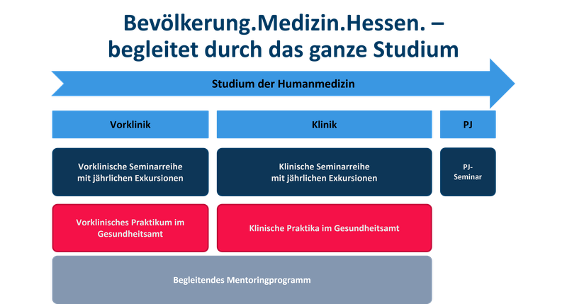Die Teilnehmenden erwartet ein abwechslungsreiches, longitudinales (=mehrsemestriges) Lehrangebot, bei dem ein frühzeitiger Kontakt mit den Tätigkeiten im Öffentlichen Gesundheitswesen im Vordergrund steht. Das Curriculum umfasst weitere Bausteine wie zum Beispiel das Mentoring-Programm, ein spezielles Lerntraining, Exkursionen zu inhaltlich relevanten Einrichtungen mit Zugang zur Bevölkerungsmedizin, Lerninhalte zu praxisrelevanten Themen sowie das Erlernen sogenannter APT – Anvertraubarer Professioneller Tätigkeiten.