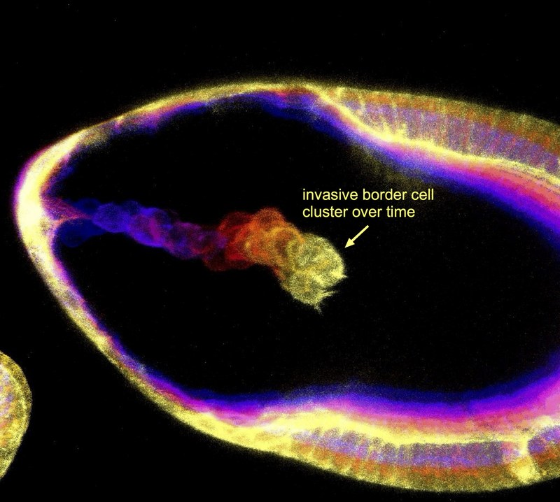 Epithelzellen sind eng miteinander verbunden, um die Gewebeintegrität aufrechtzuerhalten und dynamisch auf Veränderungen zu reagieren, die ein koordiniertes dynamisches Zellverhalten erfordern. Der Übergang von stationären Epithelzellen zu wandernden Einzelzellen oder Zellkollektiven ist sowohl für die normale Gewebemorphogenese als auch für die Tumormetastasierung von Bedeutung. Das Drosophila Ovar ist ein hervorragendes Modelsystem zur Untersuchung der molekularen Grundlagen in die Zell-Zellkommunikation während der kollektiven Zellmigration und Zellinvasion. Die Delamination und das invasive Migrationsverhalten der Grenzzellen dient als einfaches genetisch zugängliches in vivo Modell für die Metastasierung epithelialer Tumore, die konservierte Signaltransduktionskaskaden zugrunde liegen.