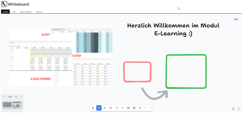 Das Whiteboard ermöglicht ab sofort die gemeinsame Visualisierung, Diskussion und Entwicklung von Inhalten direkt in ILIAS-Kursen und -Gruppen. Damit wird kollaboratives und kreatives Arbeiten in der Lehre noch einfacher und interaktiver.