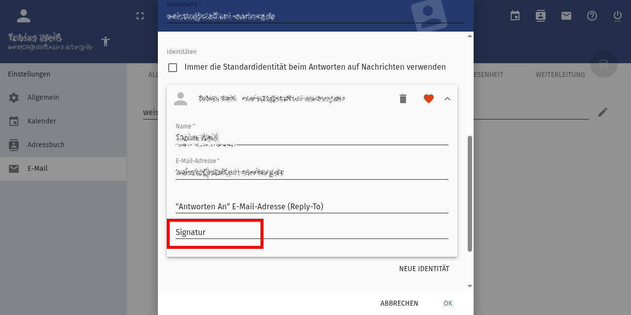 Signaturen und zusätzliche E-Mail Adressen können bei den Identitäten unter E-Mail >> IMAP-Konto erstellt werden.