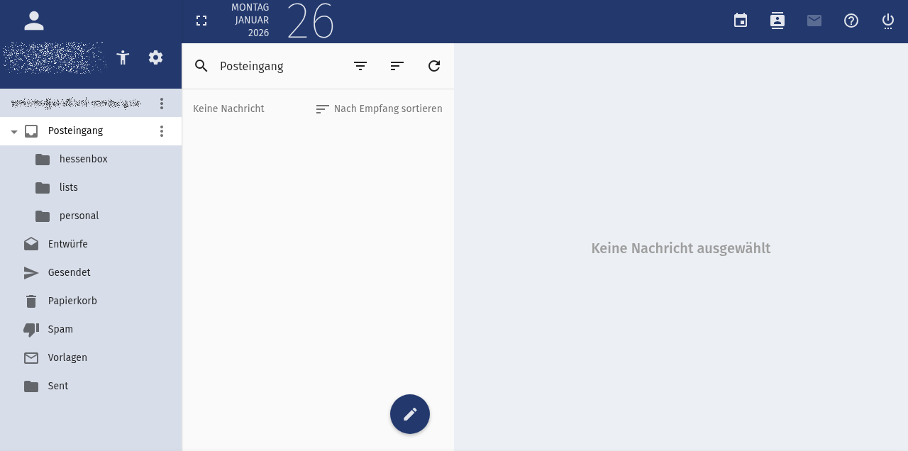 In der Benutzeroberfläche können Sie zwischen den einzelnen Diensten (E-Mail, Kalender, Adressbuch, Optionen) wechseln. Oben rechts finden Sie den Kalender, das Adressbuch, die E-Mails und die Möglichkeit, sich abzumelden. Über das Icon links neben dem Datum, können Sie die Ansicht vergrößern.