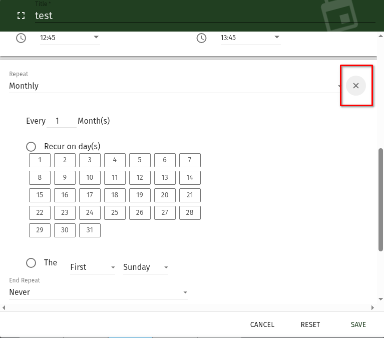 Beim Anlegen von Wiederholungen für Termine kann man auf den ersten Blick nur von...bis, "täglich, wöchentlich, monatlich, jährlich" und Ende der Wiederholung auswählen. Erst wenn eine der Optionen ausgewählt wird erscheint das "+"-Zeichen neben dem Drop-Down Menu, das weitere Optionen bietet.