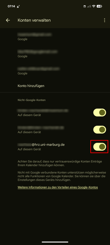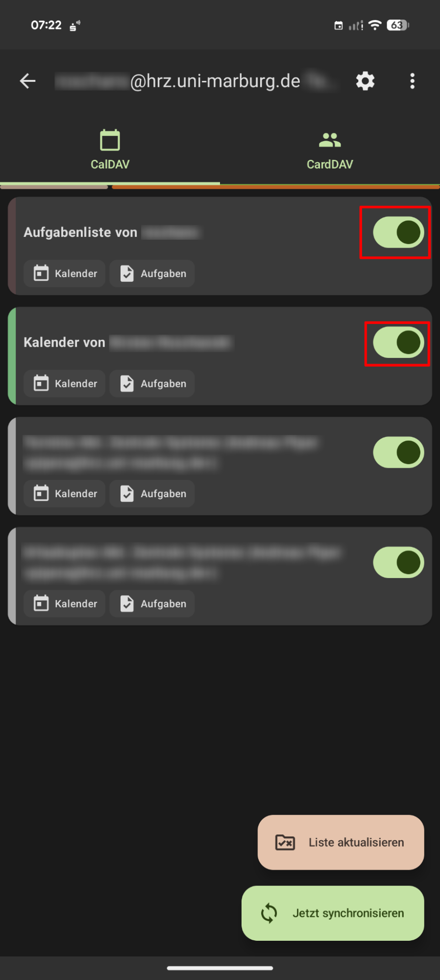 - Konto prüfen: In der Konten-Liste befindet sich nun das DAVx⁵Konto. Stelle sicher, dass der Schalter für dieses Konto AN ist.