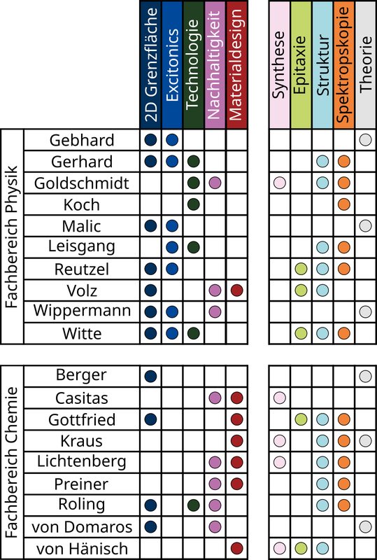 Einen Überblick über die beteiligten Arbeitsgruppen und deren Forschungsgebieten zeigt die nachfolgende Grafik. Details dazu werden unter den entsprechenden Reitern bzw auf den Homepages der einzelnen Arbeitsgruppen beschrieben.