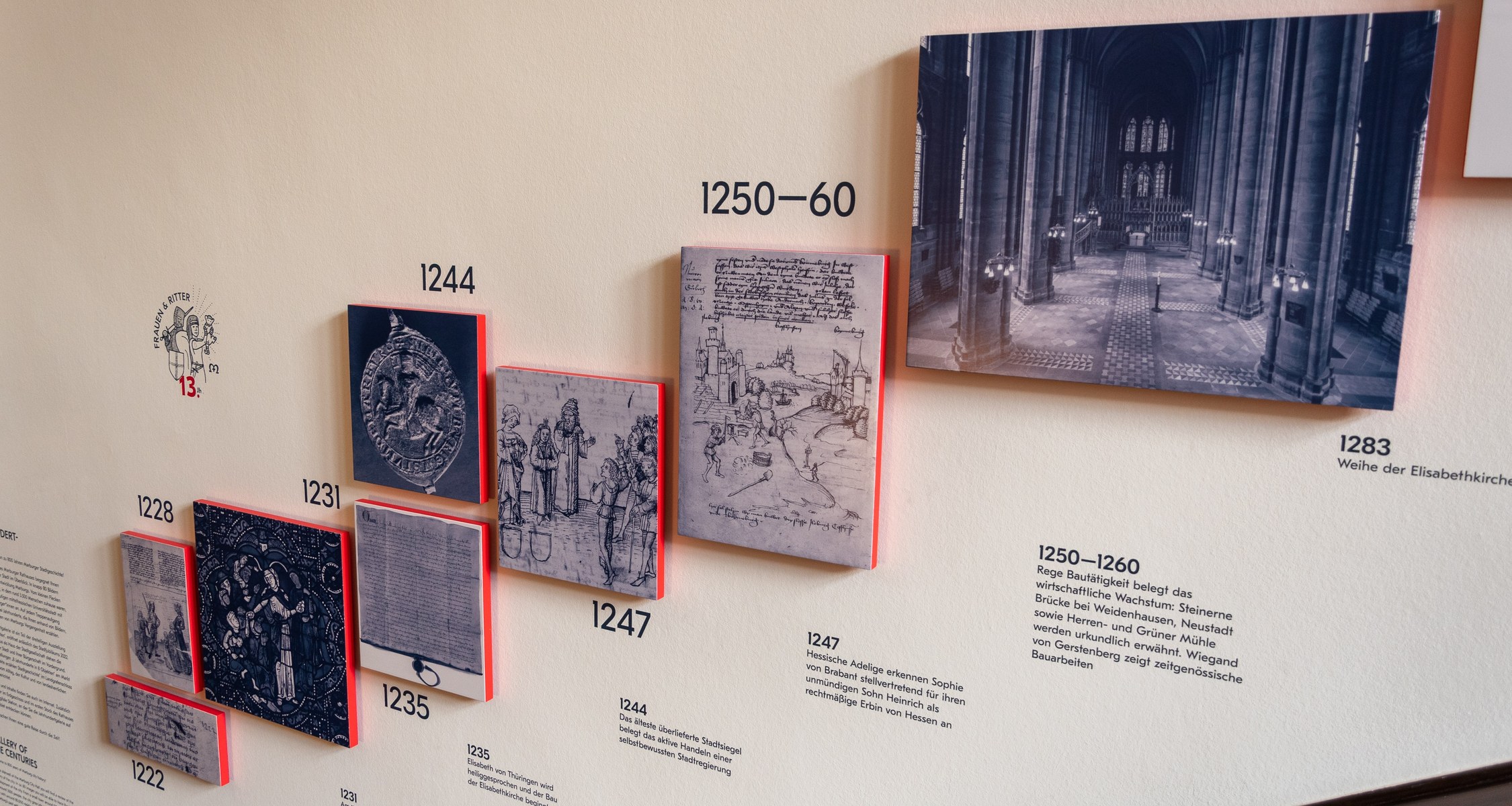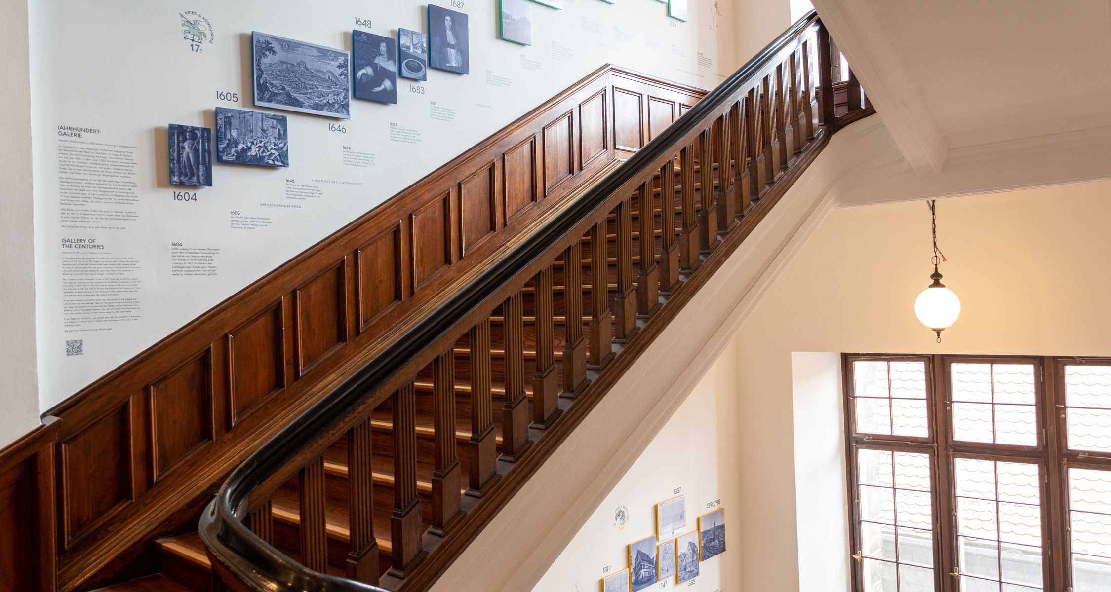 Den Auftakt der Ausstellung macht ein Zeitstrahl im großen Treppenaufgang des Rathauses, der ausgewählte Ereignisse der letzten 800 Jahre anschaulich bebildert. Nur wenige Schritte entfernt stellt die Brüder-Grimm Stube acht Objekte aus der Sammlung des Marburger Landgrafenschlosses vor, welche die Stadtgeschichte aus acht Jahrhunderten skizzieren. Zusätzlich zu weiteren Medienangeboten bietet der kleine Raum am Markt 23 den Einstieg zu kurzen Podcast-Episoden – den „Digi.tales“ –, welche auf kreative Art und Weise von vergangenen Lebenswirklichkeiten berichten.