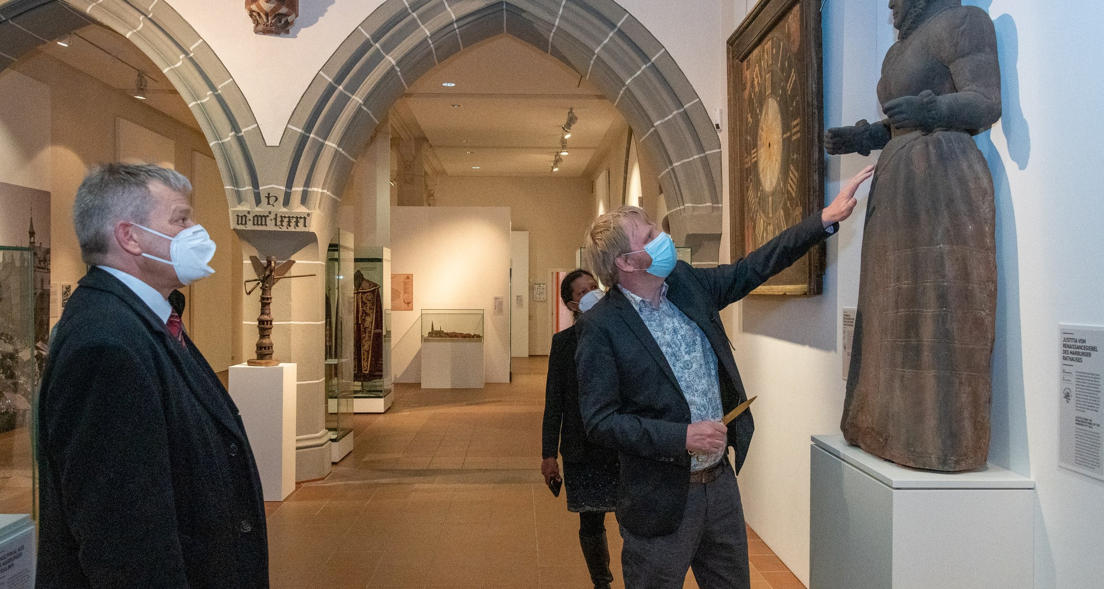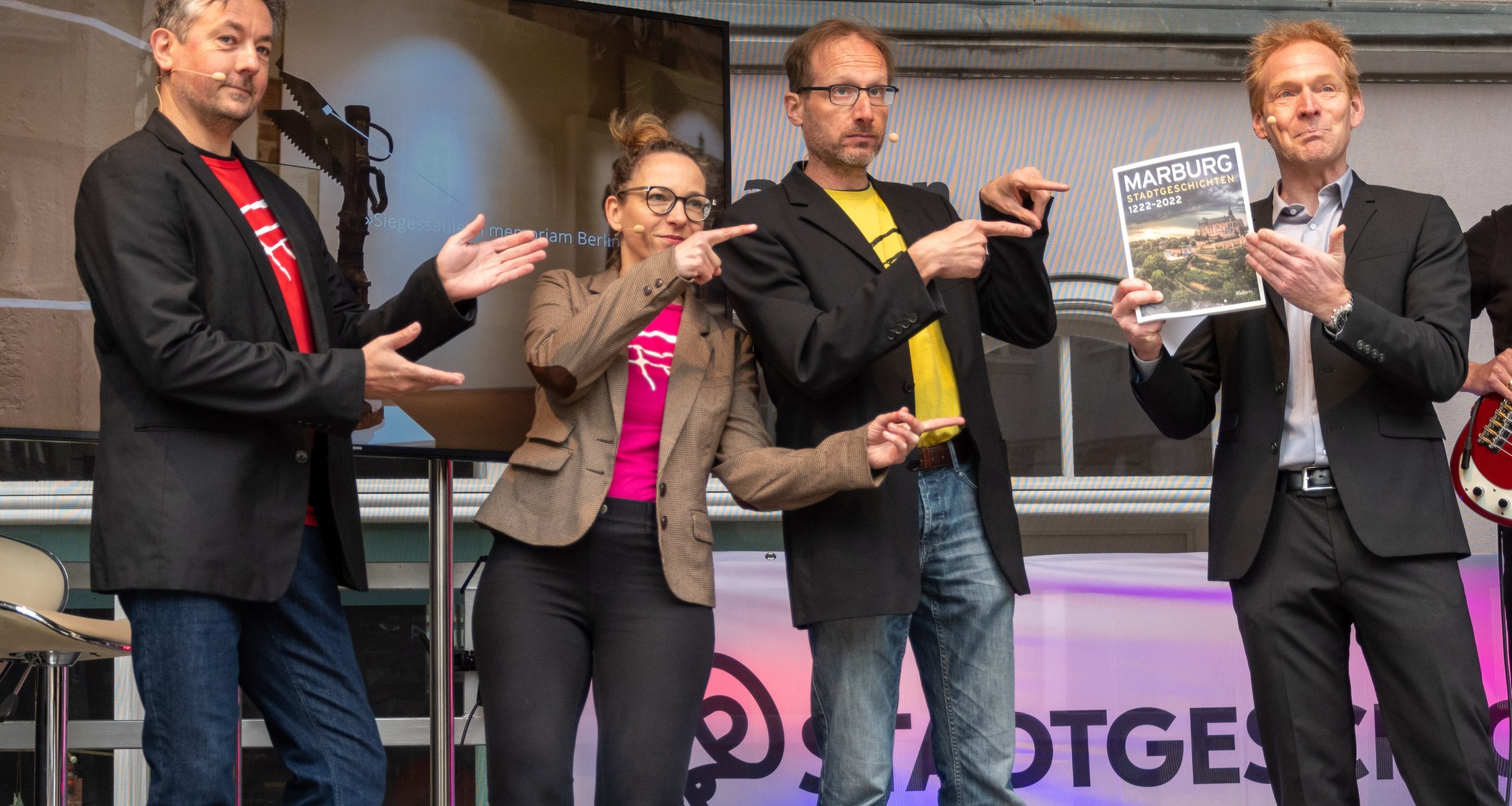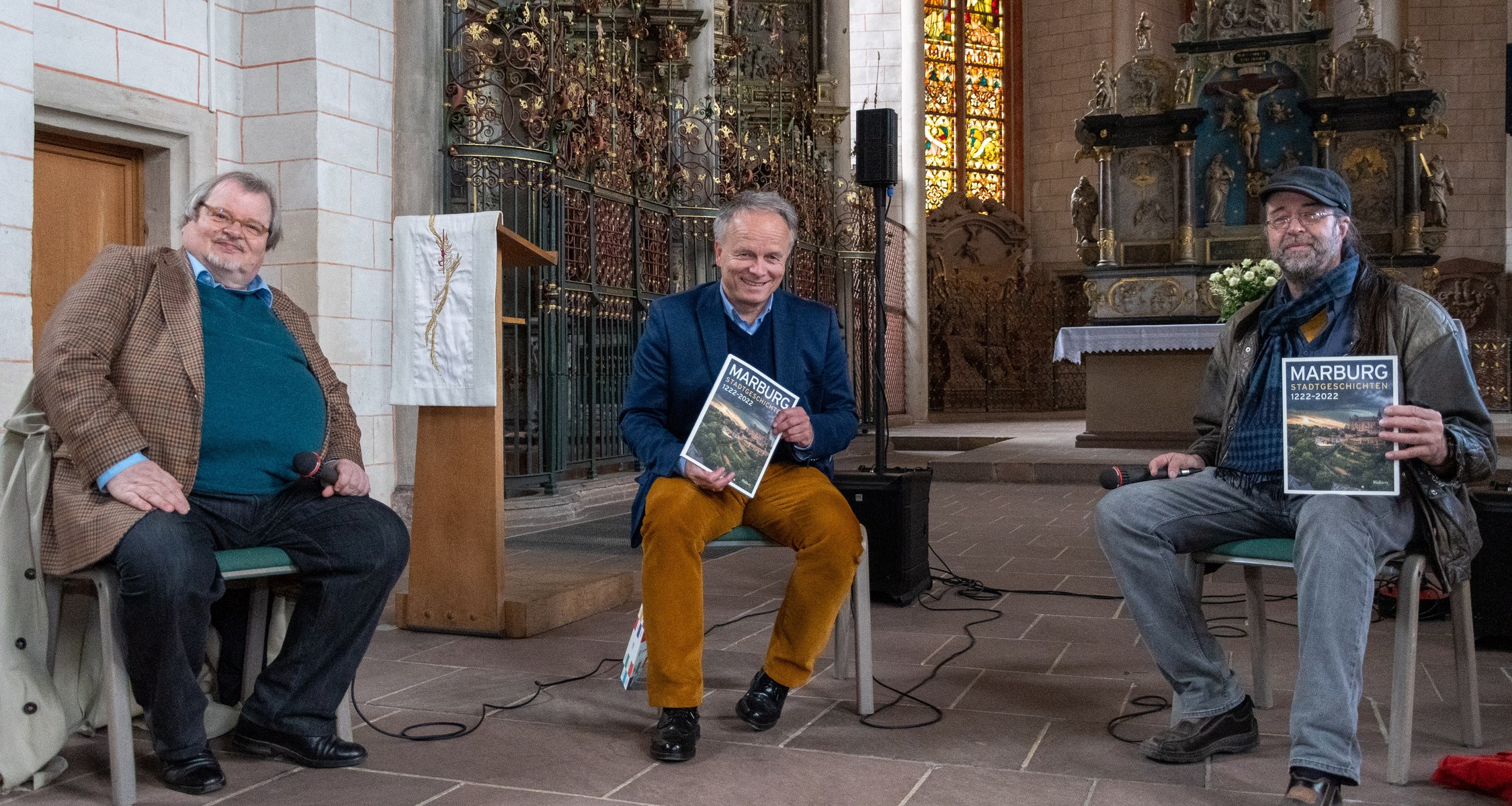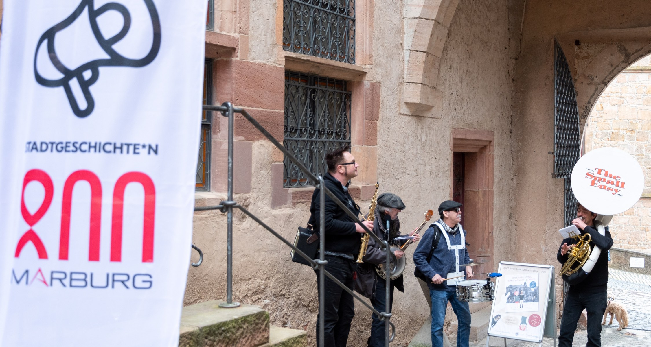Am Sonntag, den 24. April 2022 wurde die vom Fachdienst Kultur der Stadt Marburg und dem Museum für Kunst und Kulturgeschichte der Philipps-Universität entwickelte Ausstellung „Stadtgeschichte*n 1222-2022“ an drei zentralen Standorten eröffnet. Nach einer Begrüßung durch den Oberbürgermeister Dr. Thomas Spies und einem Grußwort des Präsidenten der Philipps-Universität Prof. Dr. Thomas Nauss erläuterte Dr. Christoph Otterbeck, Direktor des Universitätsmuseums, das Konzept der neuen, dreiteiligen Geschichtspräsentation. Eine große Zahl interessierter Bürgerinnen und Bürger zog mit musikalischer Begleitung vom Rathaus über den Marktplatz zum Landgrafenschloss, um die drei neugestalteten Orte erstmals zu erkunden.