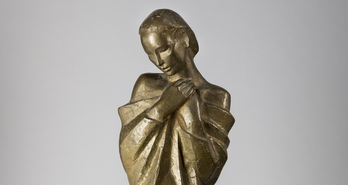 Weder eine heilige noch eine mythische Figur war Vorbild für das von Georg Kolbe 1923 geschaffene Kunstwerk. Die 81 cm hohe Bronze mit dem Titel „Adagio“ zeigt eine aufrecht stehende Frau mit vor der Brust übereinander gelegten Händen. Sie trägt ein bodenlanges Gewand, das ihre Schultern unbedeckt lässt. Der Name „Adagio“ – abgeleitet von der musikalischen Tempobezeichnung oder der Kompositionsform – deutet auf ein getragenes, ruhiges Arrangement hin. Dabei kann der italienische Begriff auch mit „bequem“ oder „behaglich“ übersetzt werden.