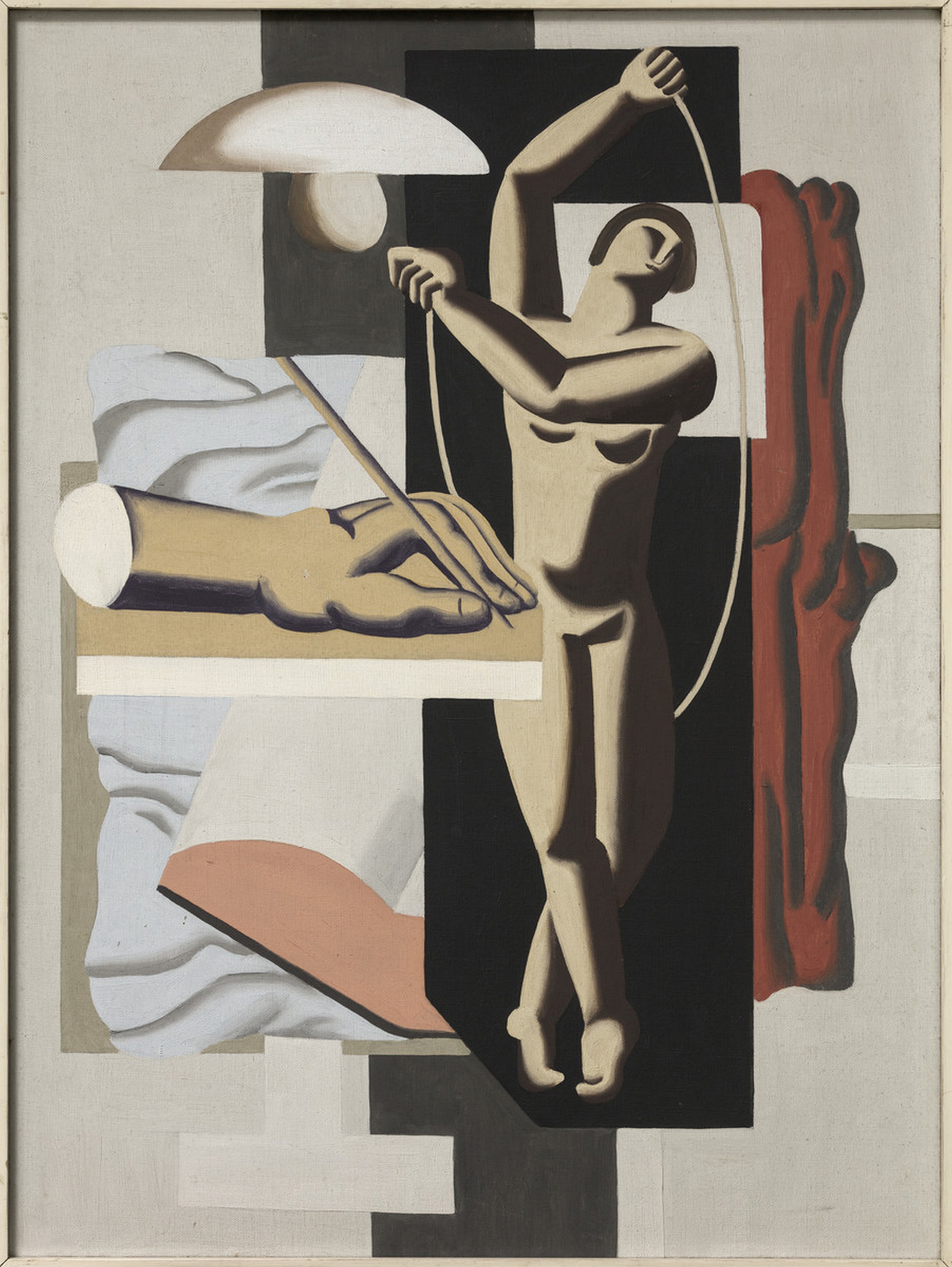 Als das Bild entstand, lebte Willi Baumeister in Frankfurt am Main und unterrichtete an der Städtischen Kunstgewerbeschule. Er gehörte zur avantgardistischen Szene rund um die Zeitschrift „Das Neue Frankfurt“, in welcher insbesondere die Fragen der Architektur und des Städtebaus, aber auch des modernen Designs besprochen wurden. Das Gemälde der Marburger Sammlung lässt sich trotz dieser Kontexte nicht vollständig im Sinne eines rationalen Lebensentwurfs deuten. Die wie abgeschnitten wirkende einzelne Hand bringt etwas Befremdliches ins Spiel. Und die Hauptfigur scheint mehr eine Pose einzunehmen, als von wirklicher Dynamik erfasst zu sein. Der rote Vorhang schließlich lässt als barockes Bildzitat an eine bühnenhafte Inszenierung des Zeitgeistes denken.