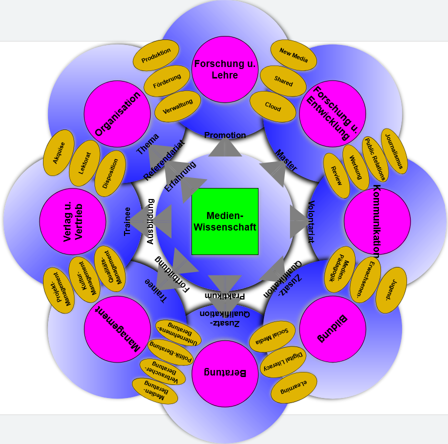 Menschen, die sich für die Medienwissenschaft interessieren, die ggf. in absehbarer Zeit einen medienwissenschaftlichen Abschluss erwerben werden, können sich also sowohl in den Tätigkeitsfeldern der Kunst- und Kulturwissenschaften, als auch in den Gesellschaftswissenschaften zusätzliche Inspiration holen. Aber sie ist ein eigenes Fach, eine eigene Welt – ein eigenes „Berufsfeld“.