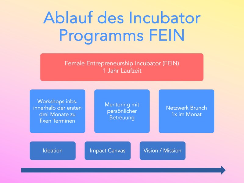 Die Teilnahme am 12-monatigen Female Entrepreneurship Incubator (FEIN), einschließlich individuellem Coaching durch Gründungsberaterinnen, unternehmerische Unterstützung durch eine Mentorin, Zugang zu einem bundesweiten Gründerinnen-Netzwerk und ein einmaliger Sachmittel in Höhe von 2.000 Euro für bspw. Coaching, Reisekosten oder die Validieren deiner Gründungsidee