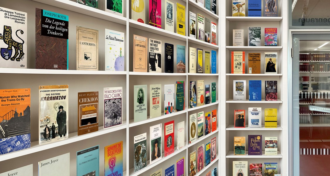 Mit „Orlando’s Library“ verwandelt die Künstlerin Daniela Comani einen Gruppenarbeitsraum in der Zentralbibliothek der Philipps-Universität Marburg in ein begehbares Bücherregal, das den Kanon der Weltliteratur aus ungewohnter Perspektive sichtbar macht. Auf raumgreifenden Tapeten, die Bücherregale zeigen, versammeln sich vertraute Klassiker – etwa von Fedor Dostojewski, Miguel de Cervantes und Gustave Flaubert bis zu Ernest Hemingway, Antoine de Saint-Exupéry oder Robert Musil. Doch wer kann für sich behaupten, „Die Schwestern Karamasow“, „Doña Quixote“ oder „La petite princesse“ wirklich schon gelesen zu haben?