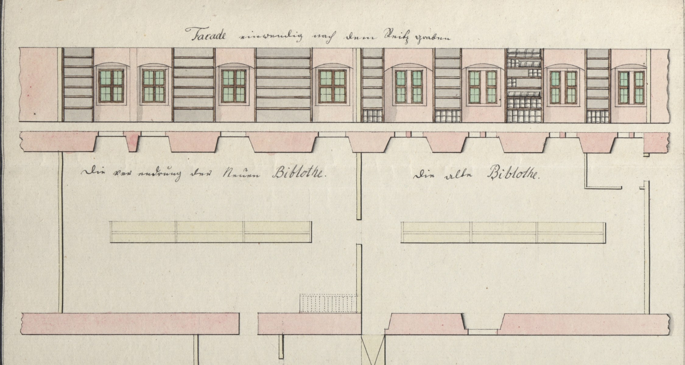 Der Akte mit dem Schriftwechsel und den Kostenvoranschlägen zu der Baumaßnahme sind auch zwei Grundrisse beigegeben, die den bestehenden Zustand und den geplanten Umbau zeigen, außerdem einen Aufriss der Innenwand nach Süden. Während in dem nur erst geplanten Raum die Regale noch alle leer sind, zeichnete Coester im bestehenden Bibliotheksraum ein vollständig mit Büchern befülltes Regal, in den anderen sind lediglich auf dem untersten Boden Bücher zu erkennen. Auch von der in der Raummitte platzierte „Repasedur“ zeichnete er einen Aufriss.