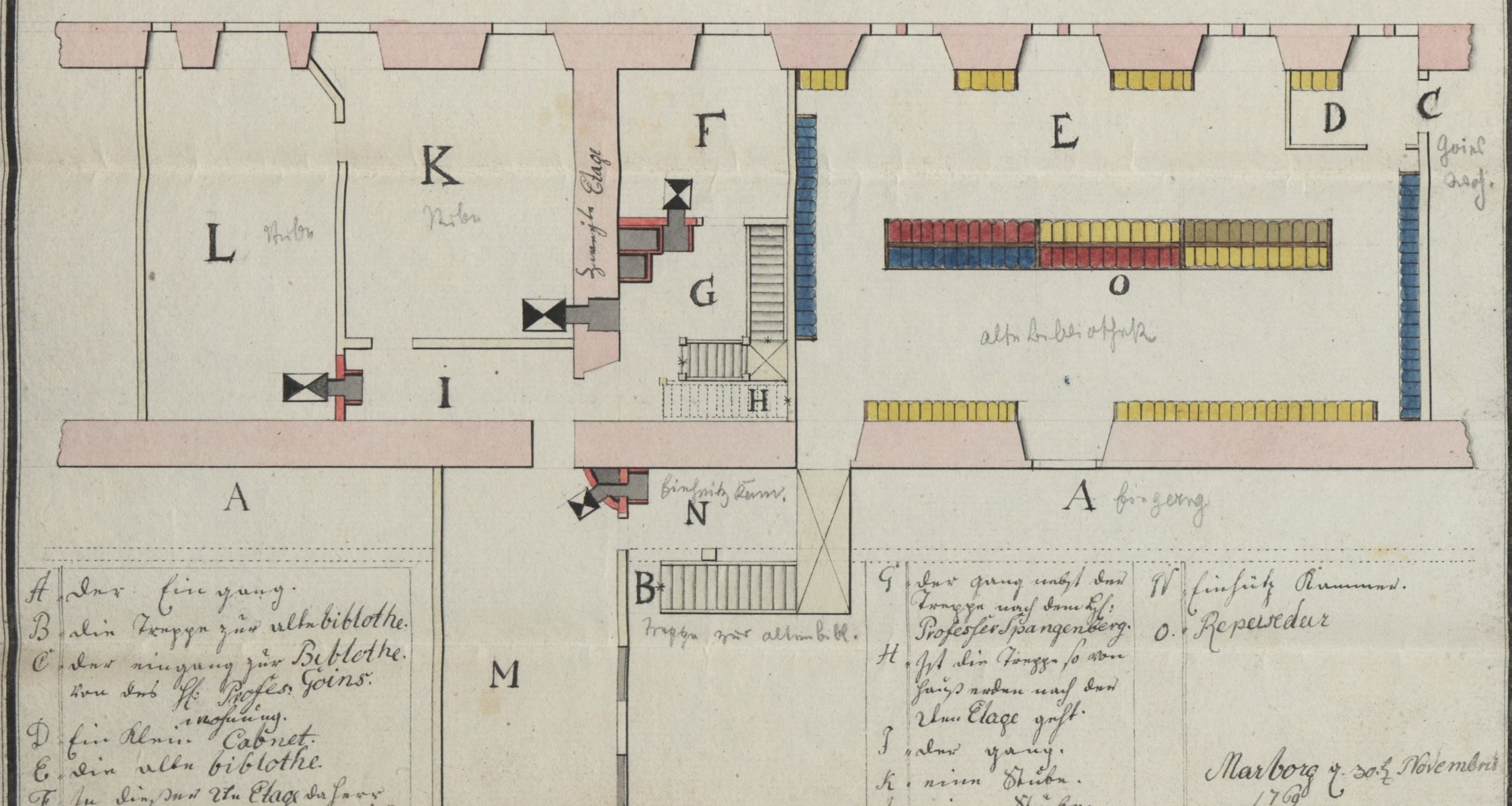 Für den erforderlichen Platz war auch durch die Initiative des Stifters Estor selbst 1769-1771 bereits gesorgt worden: Durch Umbau von einigen vorher zu der dritten Professorenwohnung gehörenden Stuben und eines Treppenhauses wurde nach dem Entwurf des Baumeisters F[ranz] Coester vom 30. November 1769 ein zweiter, genauso großer Raum wie der erste geschaffen. Die Bücher waren an den Wänden zwischen den Fenstern in raumhohen Regalen aufgestellt. In der Mitte des alten Bibliotheksraums befand sich ein von beiden Seiten zu nutzendes, offenbar nur tischhohes Regal. Ebenso sollte nach Coesters Plan der zweite Raum ausgestattet werden. Beide wurden durch einen Durchgang verbunden.