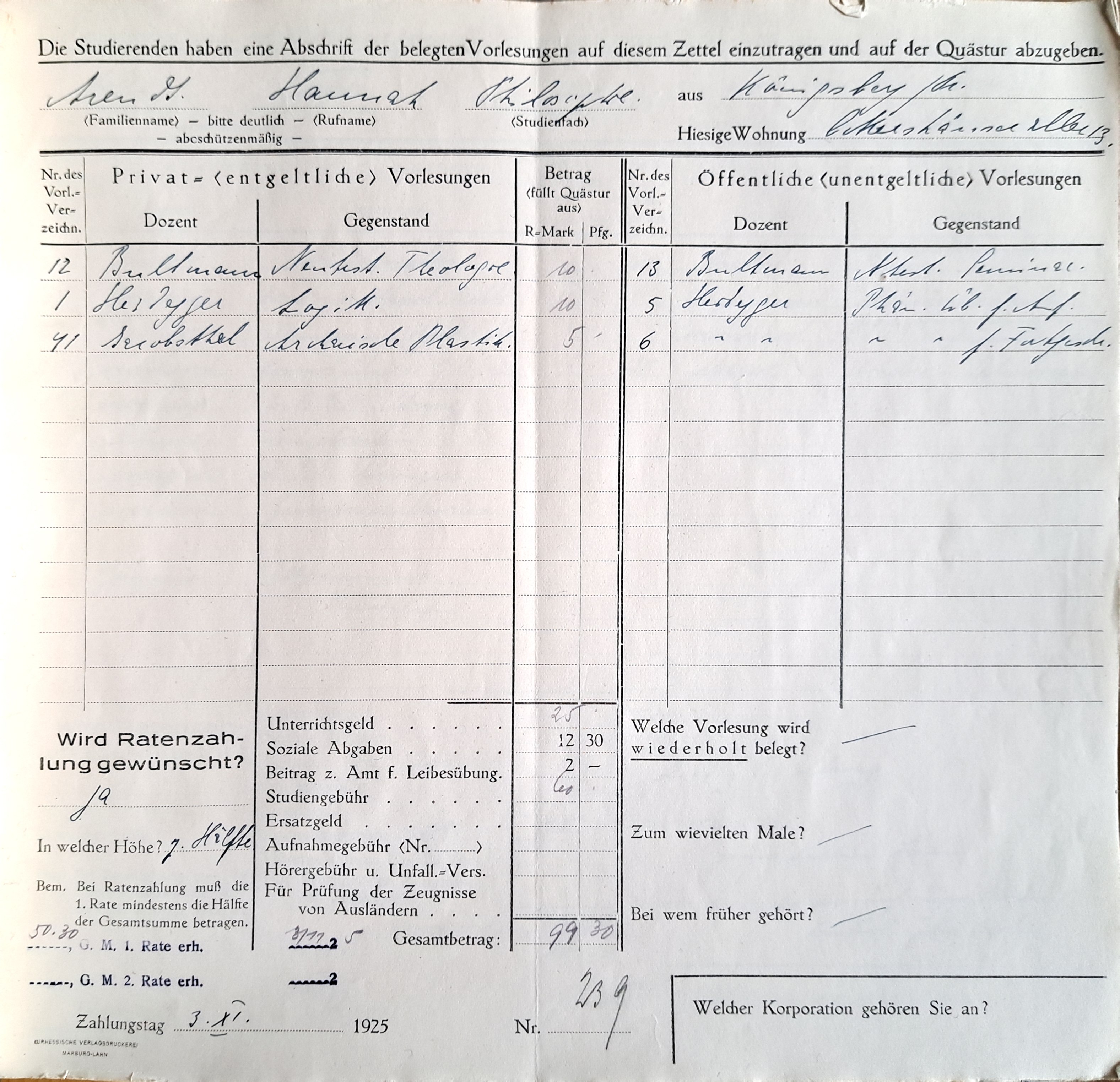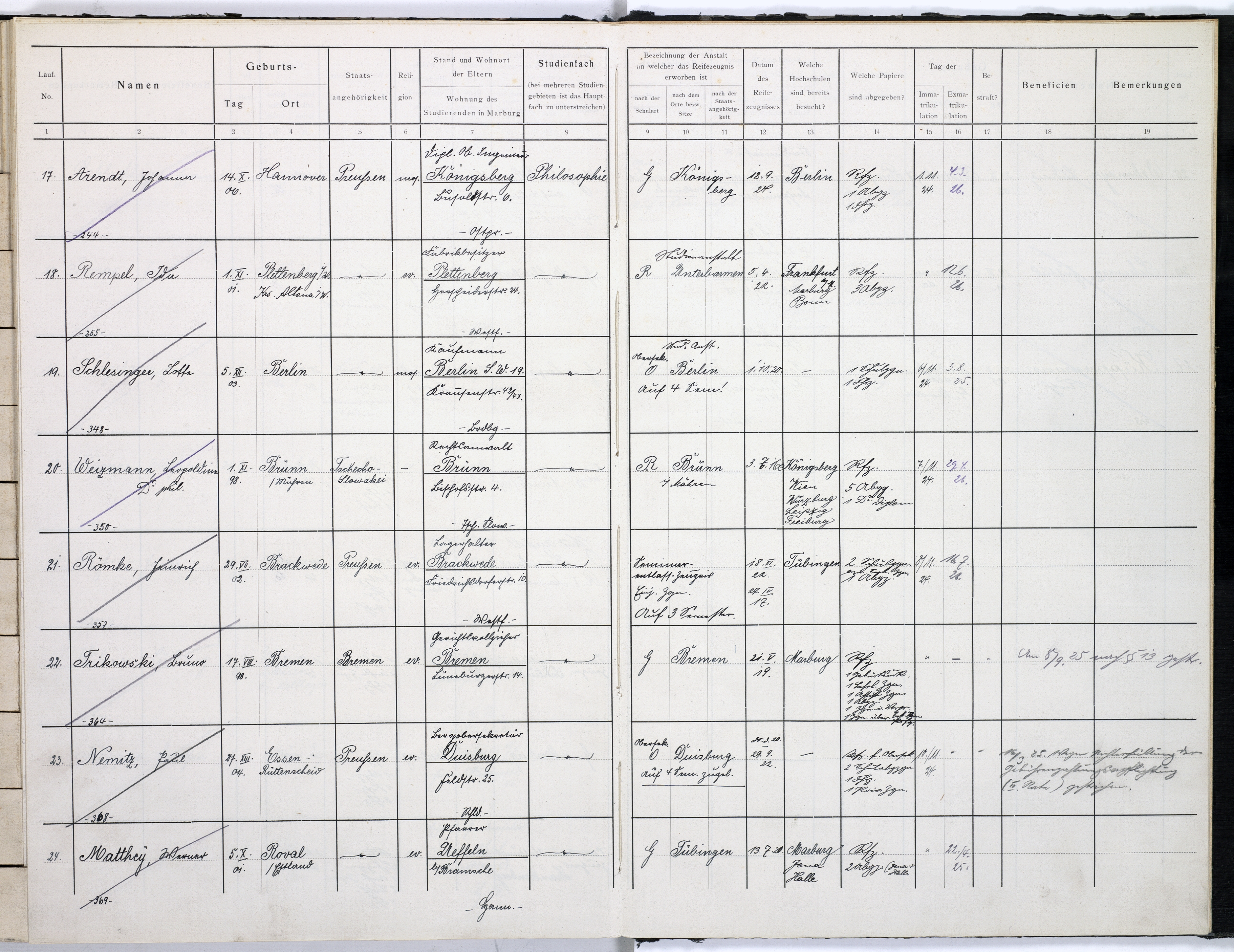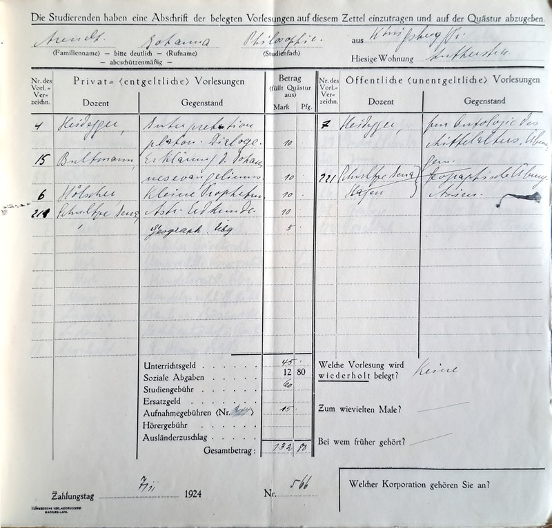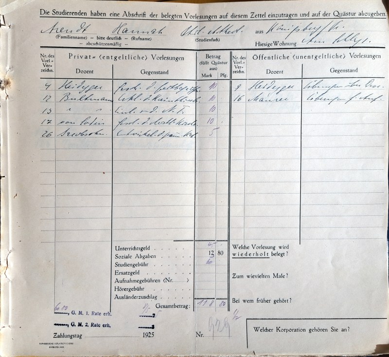 Belegbögen, ausgefüllt von Hannah Arendt, für ihre drei in Marburg verbrachten Semester, das Wintersemester 1924/25, das Sommersemester 1925 und das Wintersemester 1925/26. Nach dem sie ihren Vornamen im ersten Semester noch mit „Johanna“ angegeben hatte, wechselte sie im nächsten Semester zu „Hannah“.