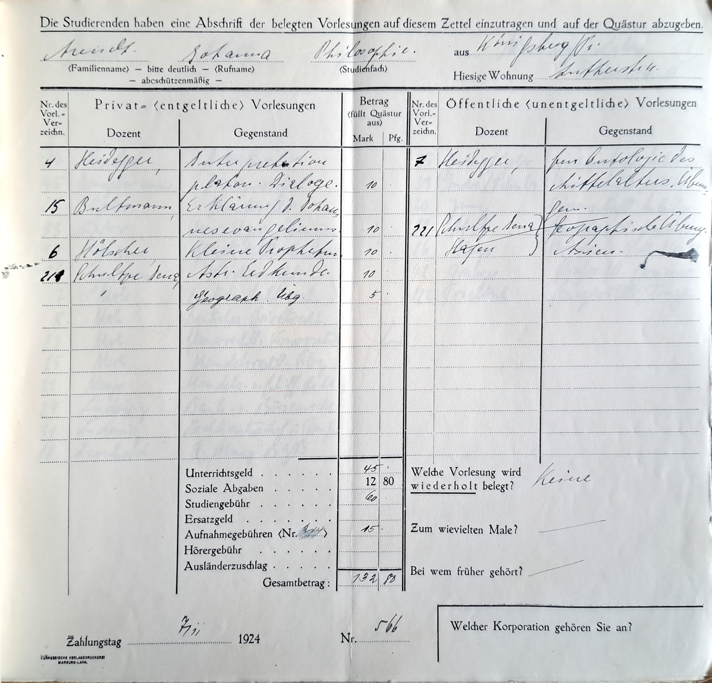 Hannah Arendt schrieb sich am 1. November 1924 zum Studium der Philosophie an der Universität Marburg ein und belegte Veranstaltungen, zunächst als Johanna Arendt, ab dem zweiten Semester dann als Hannah Arendt. Ein Freund hatte ihr von dem Philosophieprofessor Martin Heidegger vorgeschwärmt.