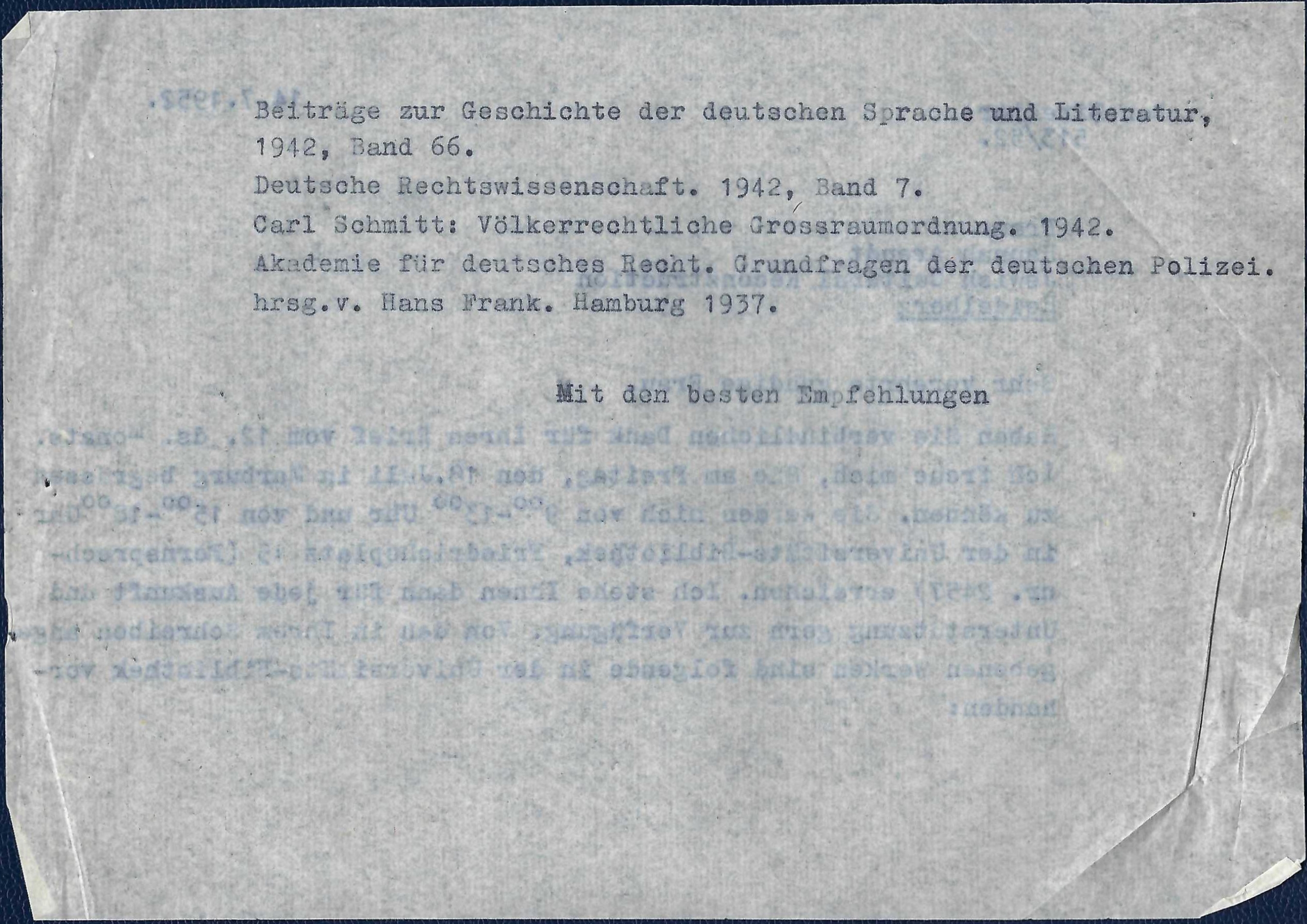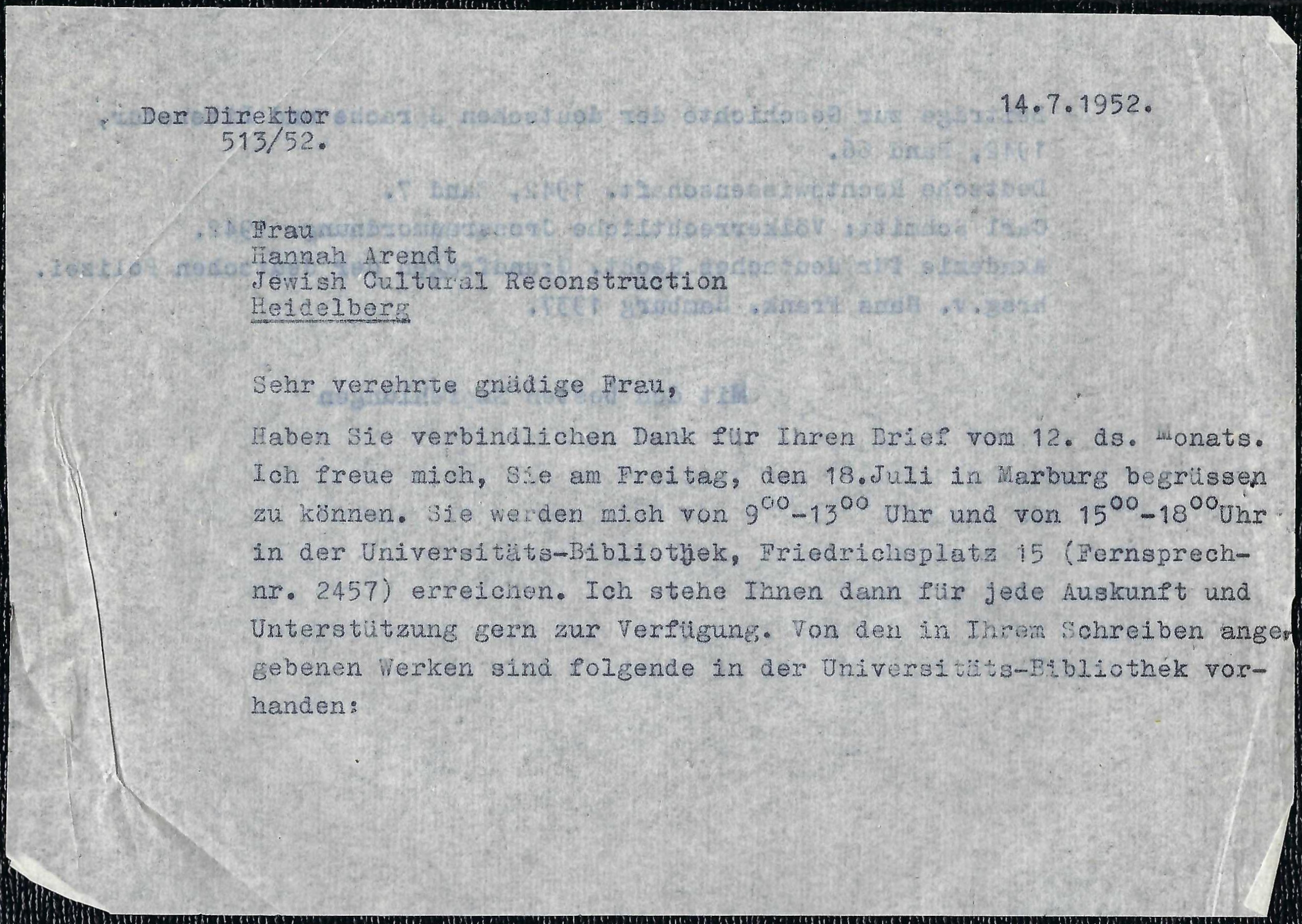 Antwort des Direktors der Marburger Universitätsbibliothek auf eine Anfrage von Hannah Arendt nach von ihr gesuchten Büchern vom 14. Juli 1952. Ob der angekündigte Besuch am 18. Juli in der Bibliothek, die zu diesem Zeitpunkt im Gebäude des Staatsarchivs untergebracht war, wirklich stattgefunden hat, ist nicht zu klären. Den in dem Schreiben aufgeführten Band von Hans Frank zitiert Hannah Arendt in der deutschen Ausgabe „Elemente und Ursprünge totaler Herrschaft“.