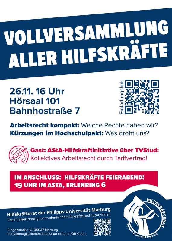 Einladung zur Vollversammlung aller Hilfskräfte am 26.11.2025, 16 Uhr im Hörsaal 101 (Bahnhofstraße 7).