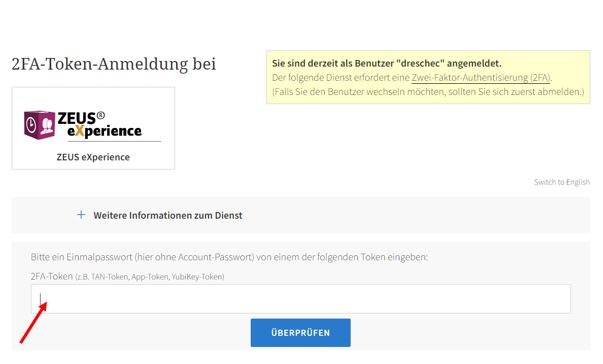 Drücken Sie für die Zwei-Faktor-Authentisierung einmal Ihren YubiKey-Token oder geben Sie den per App erzeugten Token ein.