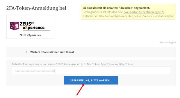 Nach Eingabe des Tokens, verändert sich der Button in „Überprüfen, bitte warten…“ und Sie werden automatisch zu ZeusX weitergeleitet.