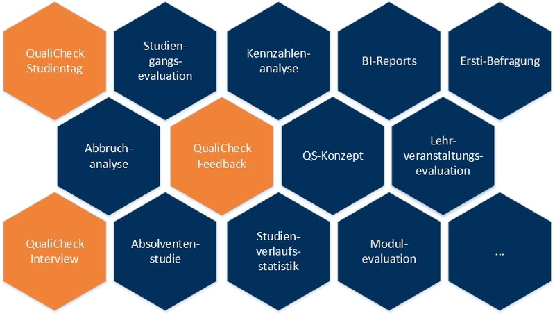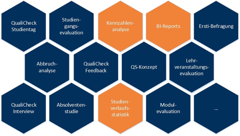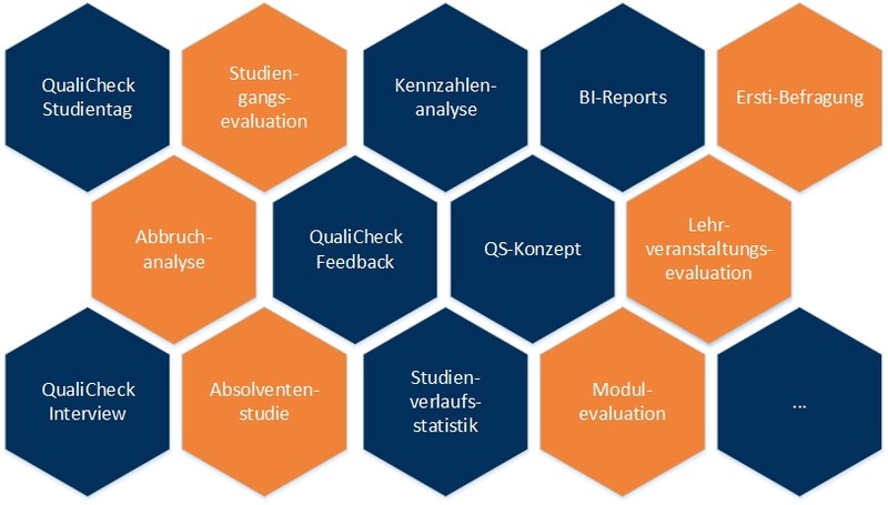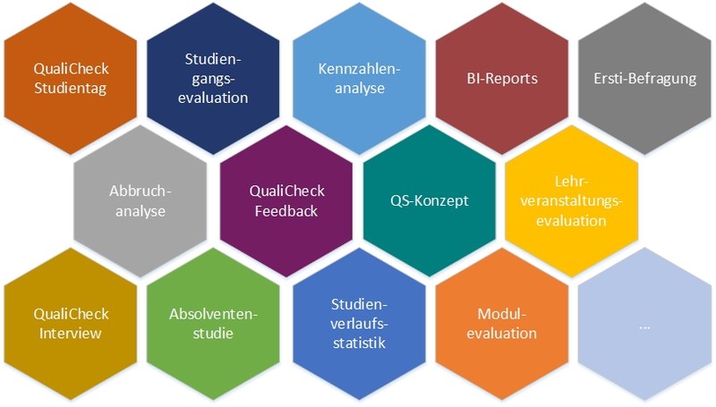 Um Ihr individuelles Qualitätssicherungsvorhaben anzugehen, empfehlen wir Ihnen ein gemeinsames Sondierungsgespräch mit unserem Team (die AnsprechpartnerIn für Ihren Fachbereich finden Sie unter Kontakt), um gezielt einzelne Instrumente zur Beantwortung Ihrer Fragen auszuwählen und einen passgenauen Zeitplan für die Erhebung, Auswertung und Besprechung der Daten auszuarbeiten. Die nachfolgenden Detailinformationen sollen Ihnen einen Eindruck der verschiedenen Instrumente vermitteln, ein gemeinsames Sondierungsgespräch aber nicht ersetzen.