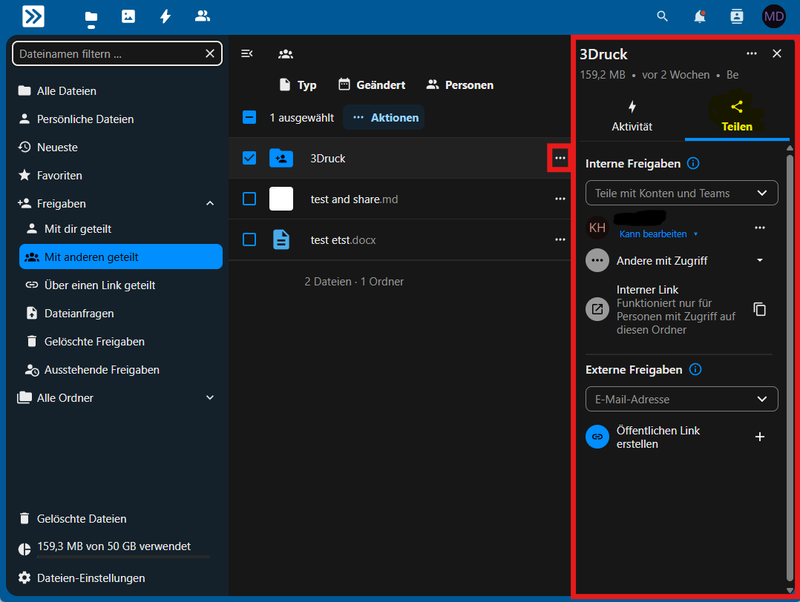 Sie können Ihren Tresor mit anderen Personen teilen. Während auf nicht-verschlüsselte Ordner oder Dateien per Freigabe im Browser oder im Nextcloud-Client zugegriffen werden kann, muss bei verschlüsselten Tresoren zusätzlich das Passwort geteilt und in jedem Fall der Nextcloud-Client verwendet werden. Unter Häufige Fragen auf der FAQ Seite der next.hessenbox finden Sie weitere Information zu Dateifreigaben.