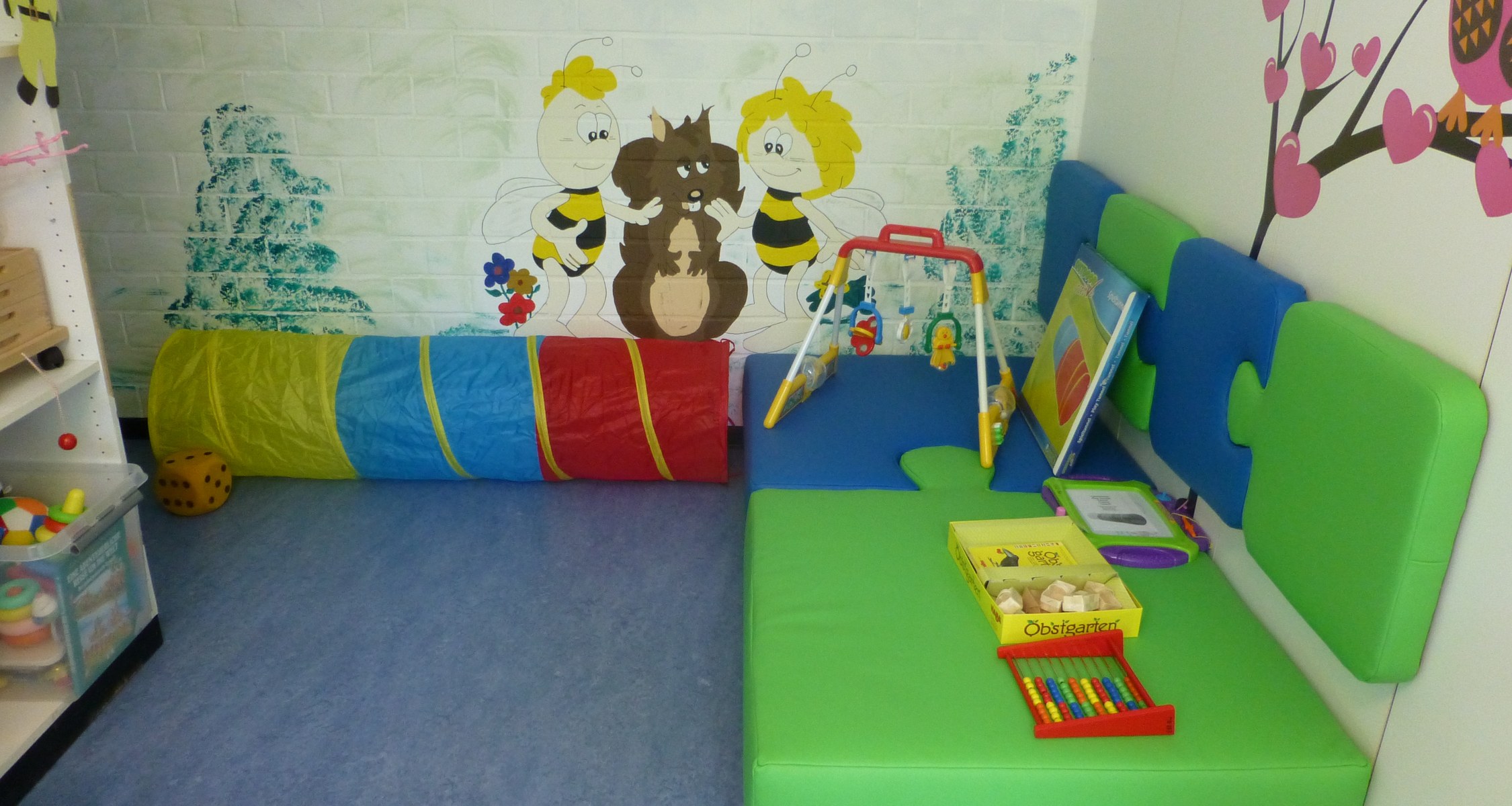 Eine umgestaltete Wohnung mit 2 Räumen plus Sanitärbereich. Ausstattung mit Arbeitsbereich, Stillstuhl, Laufgitter, Kindermöbeln und viel Spielzeug für verschiedene Altersgruppen.