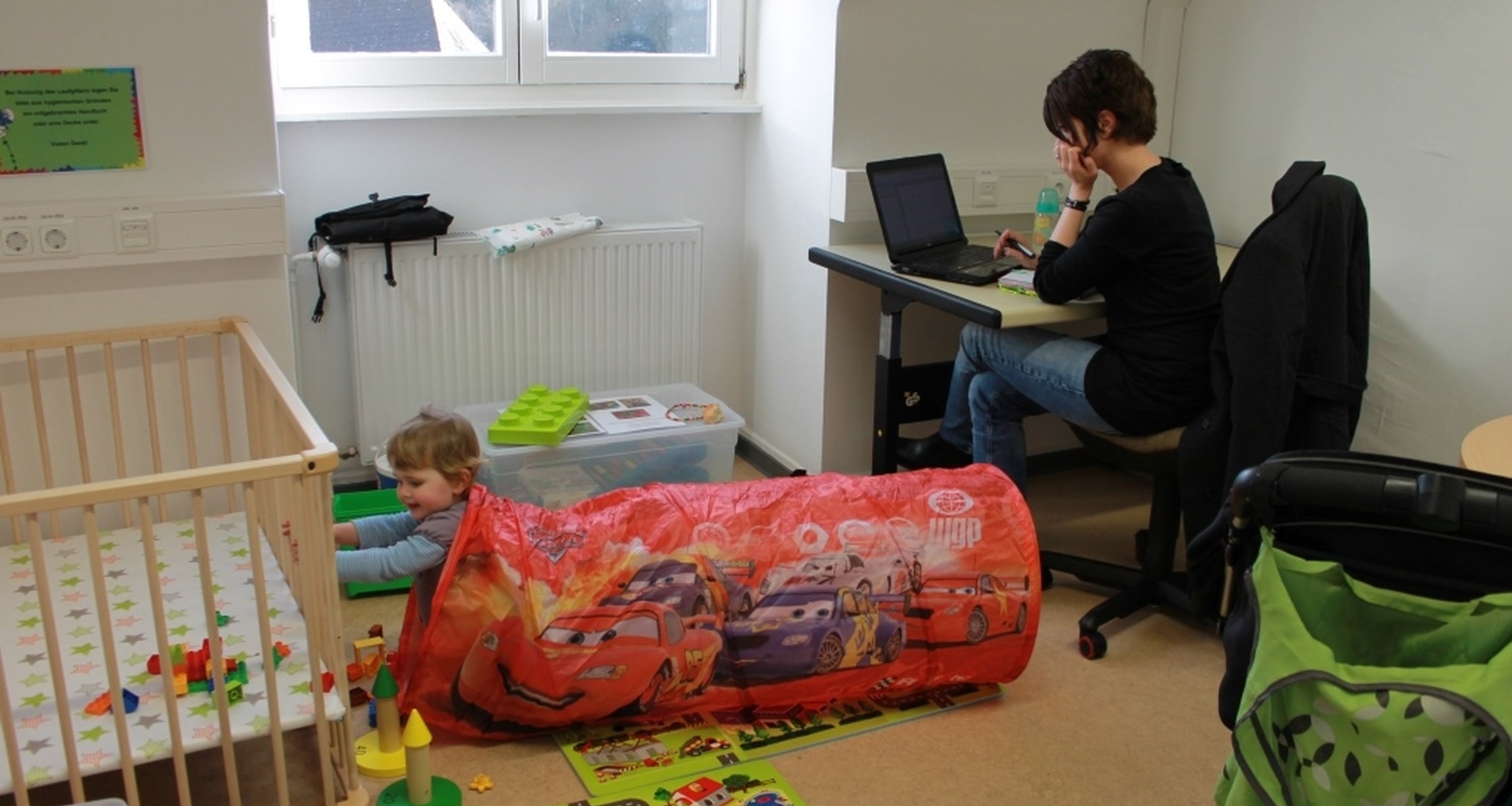Raum mit Arbeitsbereich, Laufgitter, Liege und Spielzeug für Kinder verschiedenen Alters.