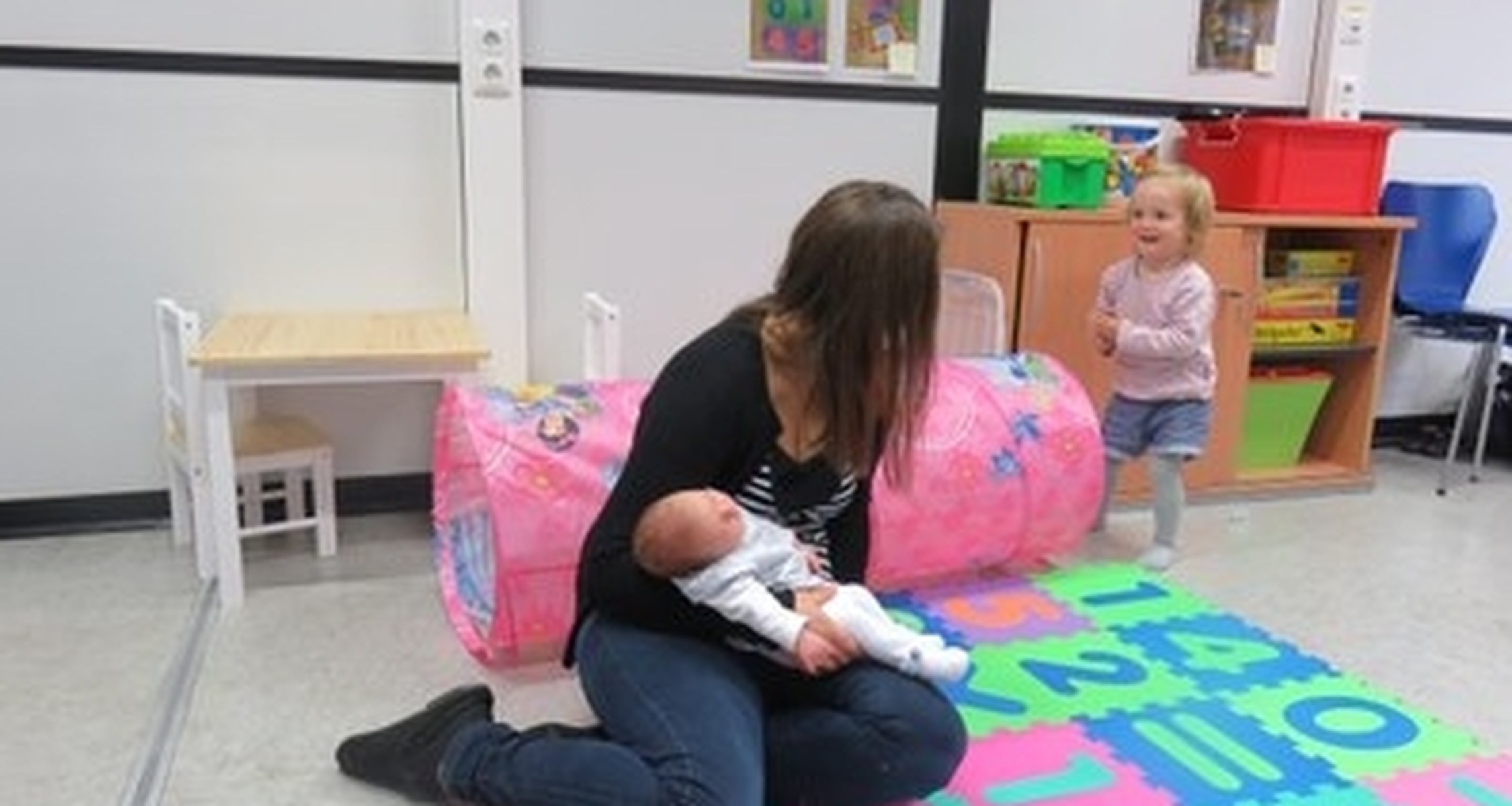 Raum mit Arbeitsbereich, Wickelbrett, Laufgitter, Flaschenwärmer, kleiner Tisch mit Stühlen und Spielzeug für Kinder verschiedenen Alters.