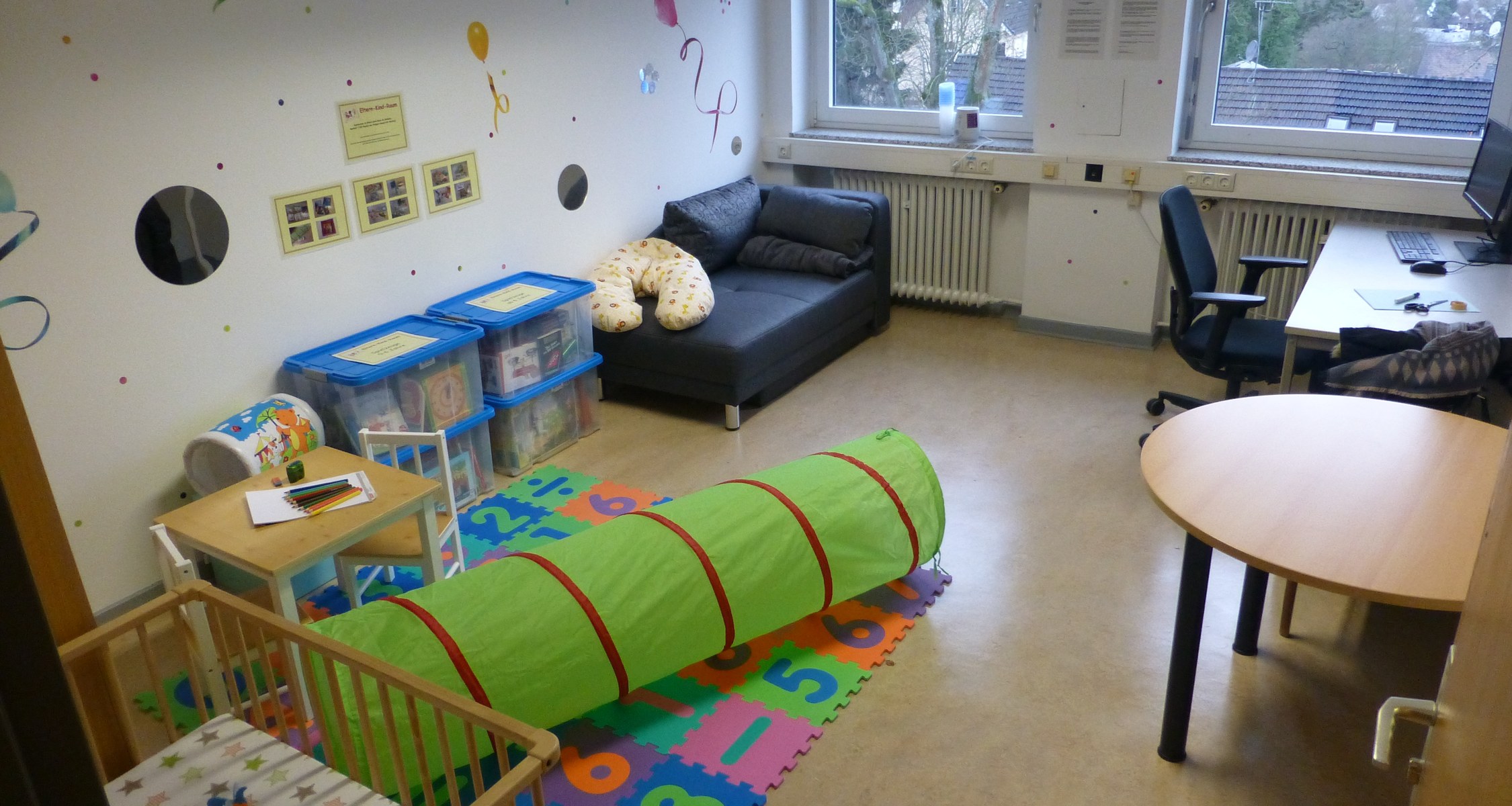 Raum mit PC-Anschluss und Arbeitsbereich sowie mit Laufgitter, Wickeltisch, Kindermöbeln und Spielzeug für verschiedene Altersstufen.