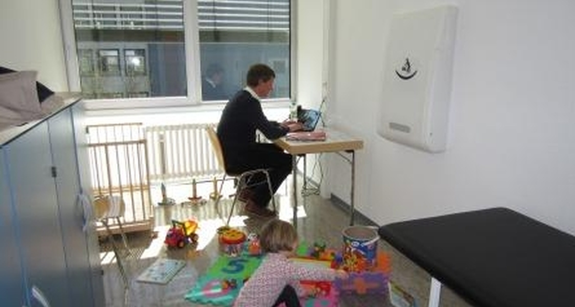 Raum mit Arbeitsbereich, Liege, Laufgitter und Spielzeug für Kinder verschiedenen Alters.