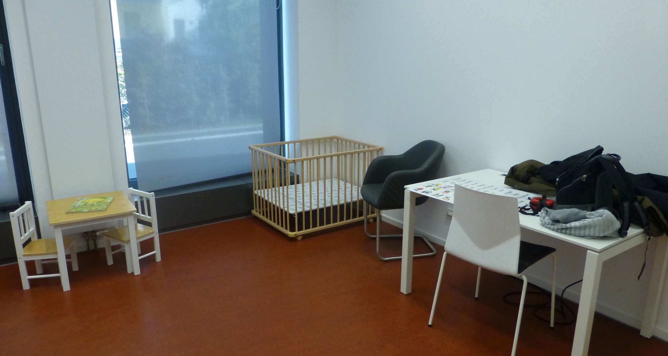 Zwei Räume sind im Erdgeschoss verfügbar. Wickelmöglichkeiten befinden sich in direkter Nähe in der barrierefreien Toilette. Jeder Raum ist mit einem PC-Arbeitsplatz, Besprechungstisch, Laufgitter, Kindertisch mit Kinderstühlen, einem bequemen Sessel und jeder Menge Spielzeug und Büchern für Kinder zwischen 0 und 12 Jahren ausgestattet.