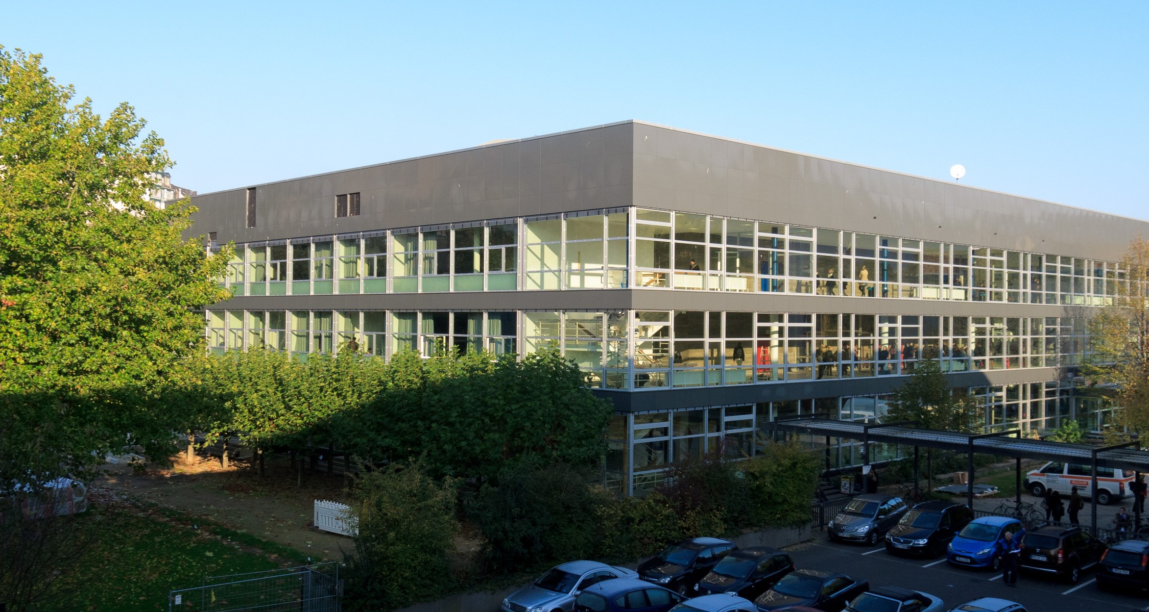 Das im Jahre 1964 fertig gestellte und mittlerweile unter Denkmalschutz gestellte Gebäude ist ein gelungenes Beispiel für die Architektur der Zeit: In der Tradition der Klassischen Moderne stehend, besticht die Gebäudehülle durch ihre klare, lineare Struktur, die dem kubischen Baukörper bei aller Kompaktheit durchaus auch Tranparenz und schlichte Eleganz verleiht. Die Fassade des dreigeschossigen Stahlbetonskelettbaus wird durch umlaufende, transparente und anthrazitfarbene Fassadenbänder horizontal gegliedert, die Geschosse sind dadurch von außen deutlich ablesbar. Eingefasst von umlaufenden Fluren, Treppenhäusern sowie Sanitär- und Seminarräumen im Norden und Süden, markiert ein massiver Hörsaalblock das Zentrum des Gebäudes. Hier finden sich auf drei Geschossen zehn Hörsäle von unterschiedlicher Größe sowie das etwa 900 qm große Auditorium Maximum.
