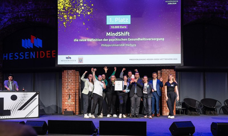 Applaus für das Team von "MindShift" der Philipps-Universität Marburg. Beim zehnten Jubiläumstreffen der Hochschulgründungsinitiative „Hessen Ideen“ wurde es mit dem ersten Preis des Hessen Ideen Wettbewerbs 2025 ausgezeichnet. Das interdisziplinäre Team aus Medizin, Psychologie und Neurowissenschaft setzte sich gegen 39 weitere Ideen aus 15 hessischen Hochschulen durch und überzeugt mit einer innovativer Technologie zur Behandlung von Depressionen. Der Preis ist mit 10.000€ dotiert.