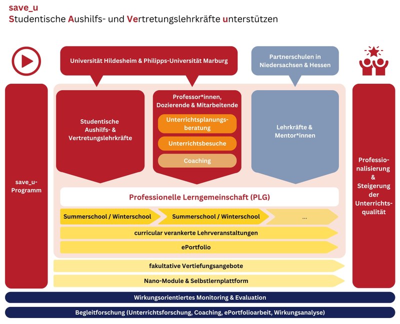 Die Hauptmaßnahmen des save_u Programms bilden sogenannte professionelle Lerngemeinschaften (PLG), eine Unterrichtsplanungsberatung sowie Unterrichtsbesuche, ein Coaching-Zyklus, digitale Selbstlernmodule und ein spezielles ePortfolio, das die wissenschaftsgeleitete Reflexion der Studierenden unterstützt.