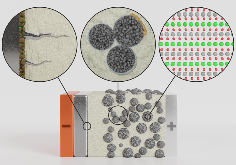 In our research group, we work on the batteries of the future that are intended to eventually replace conventional lithium-ion batteries. Solid-state batteries based on lithium or sodium are particularly promising, as they use a solid material instead of a liquid electrolyte. This enables the use of new anode materials, increasing the energy density compared to conventional lithium-ion batteries. In addition, safety is improved through the use of non-flammable materials and enhanced thermal stability. However, several challenges still need to be resolved before solid-state batteries can replace lithium-ion batteries. In particular, the interfaces between the solid electrolyte and the anode or cathode pose a problem, as unwanted phases can form there or the materials may delaminate, blocking ion transport. To avoid these issues, a fundamental understanding of the materials is required. We use our high-performance electron microscopes to investigate the chemical composition and structure of these materials down to the atomic scale. An example workflow for the investigation of battery materials can be seen in the video of the FestBatt project.