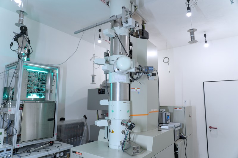 The central characterization method of our research group is (scanning) transmission electron microscopy. We operate two high-performance transmission electron microscopes, and an additional, highly advanced microscope is currently being installed. With our microscopes, it is possible to resolve the atomic structure of our samples in imaging mode. Measurements in diffraction mode provide information on the orientation and phase of the samples. Furthermore, spectroscopic techniques such as energy-dispersive X-ray spectroscopy and electron energy-loss spectroscopy yield insights into the chemical composition of the sample as well as the nature of the chemical bonding.