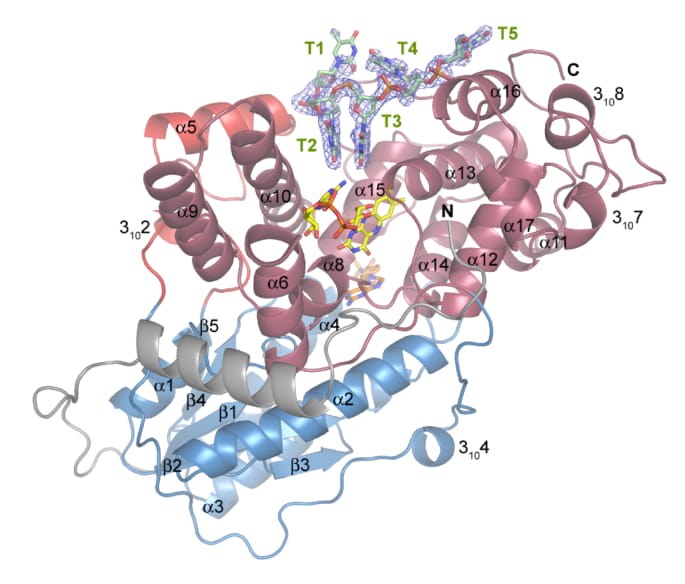 isthaliana Cryptochrome 3 (cry3) structure. Ribbon model of complex A from A. t. cry3 and the repaired CPD damage in sticks representation with SIGMAA-weighted Fobs-Fcalc omit electron density (light blue, contoured at 2 σ) defining the oligonucleotide. The catalytic domain (dark red) of A. t. cry3 contains the catalytic FAD cofactor (yellow) and the antenna chromophore MTHF (orange) in the contact region to the antenna domain (blue). Nomenclature and definition of secondary structure elements are given in (Brudler R. et al. (2003) Identification of a new cryptochrome class: Structure, function, and evolution. Mol Cell 11:59-67.12). Taken from Pokorny et al. (2008).