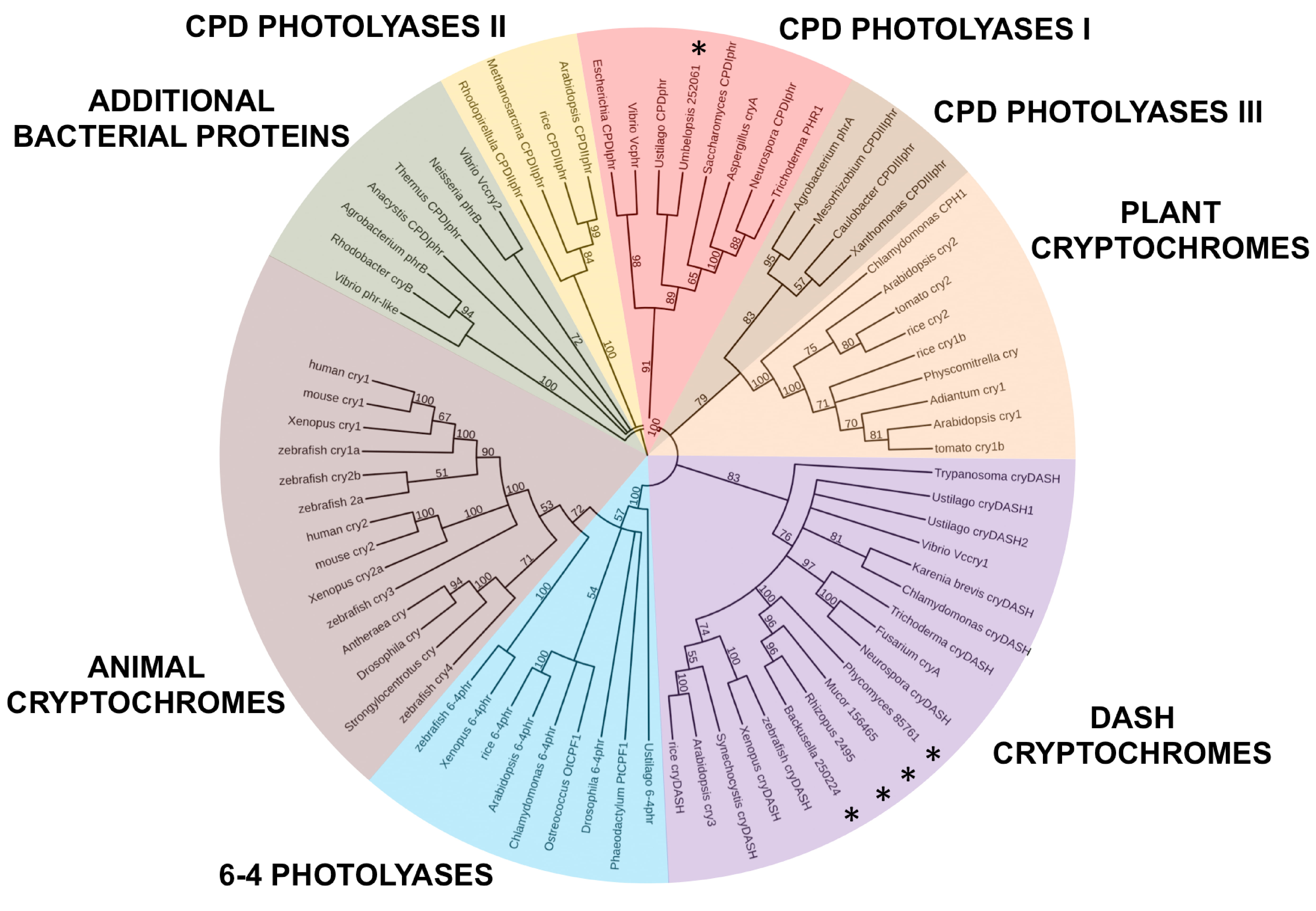 Cladogram representing the distribution and evolutionary relationships of members of the photolyase/cryptochrome family in a broad range of organisms. The eight subfamilies are indicated with different colors, following the classification of Chaves et al. (2011). Asterisks mark the position of members of the photolyase/cryptochrome family in mucoromycotina fungi. The phylogenetic tree is midpoint rooted and has been obtained using the NJ method with nodal support referred to 1000 pseudoreplicates. Only the topology is presented, and branches are not proportional to the amount of evolutionary change that has taken place along them. Bootstrap values above 50% are shown at the respective nodes. Bootstrap nodes under 50% have been collapsed. Taken from Tagua et al., (2015).