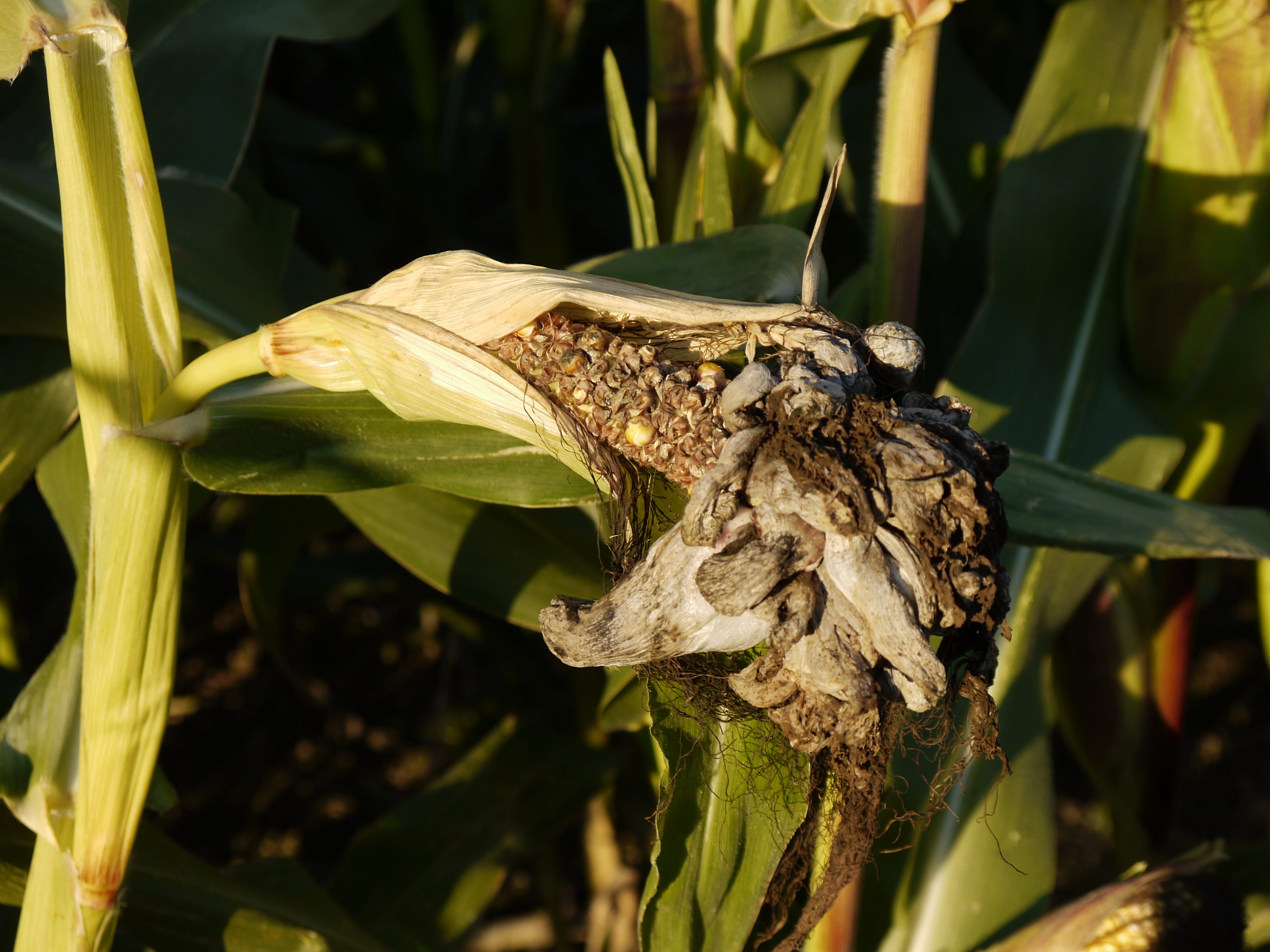 The picture shows the formation of black teliospores on corn ears which is the final step in the biotrophic phase in the diphasic life cycle of U. maydis.