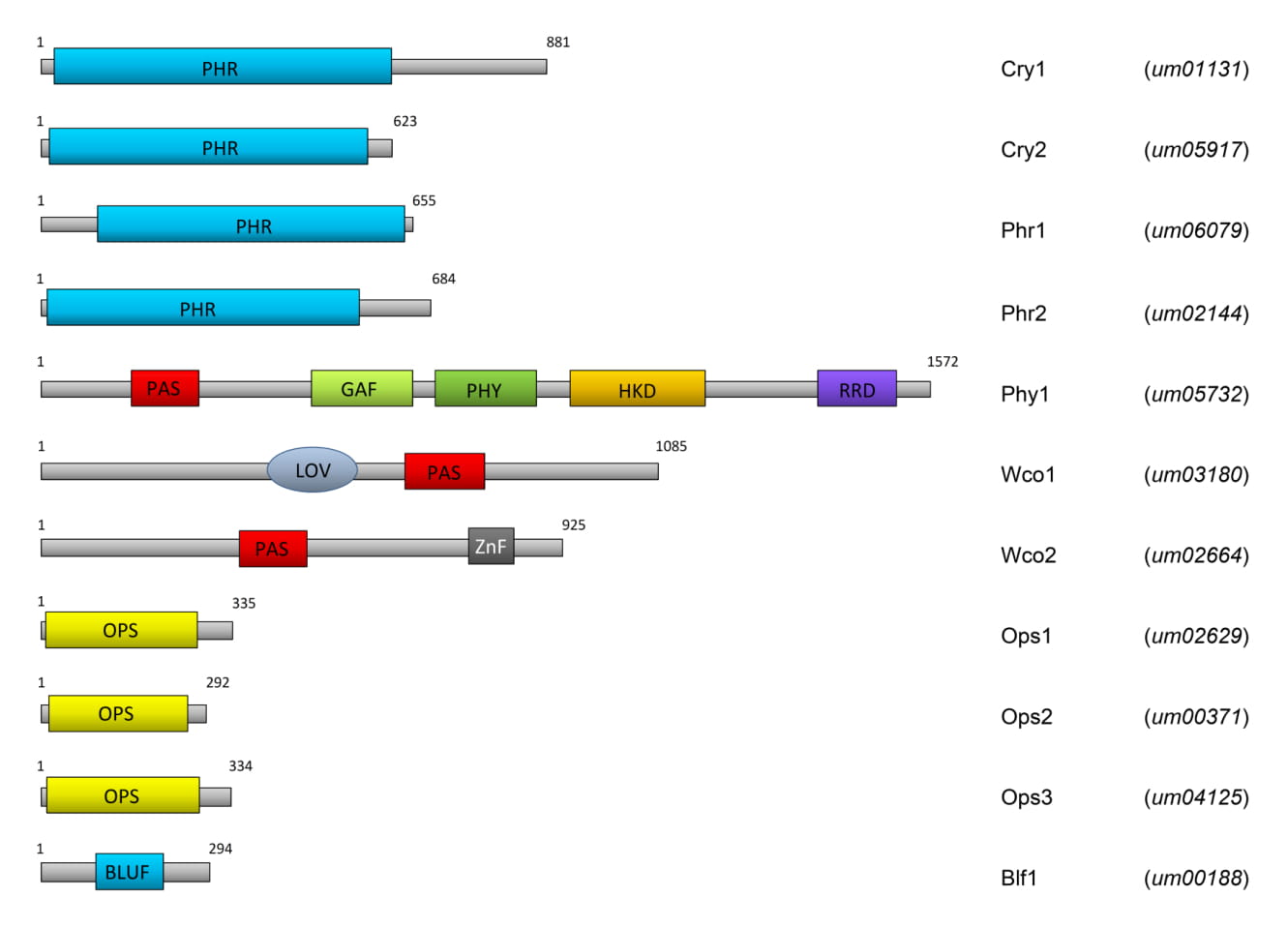 Although fungi are not photosynthetically active, they nevertheless control many developmental processes and biochemical reactions by light. Light is used as a signal to inform the organism indirectly about changing environmental conditions, such as dryness, availability of nutrients, etc. Fungi have a considerable number of photoreceptors for this purpose. The by us intensively investigated biotrophic fungus Ustilago maydis, which induces the disease corn smut on corn plants (Figure 1), has 10 predicted light-sensitive proteins (Figure 2).