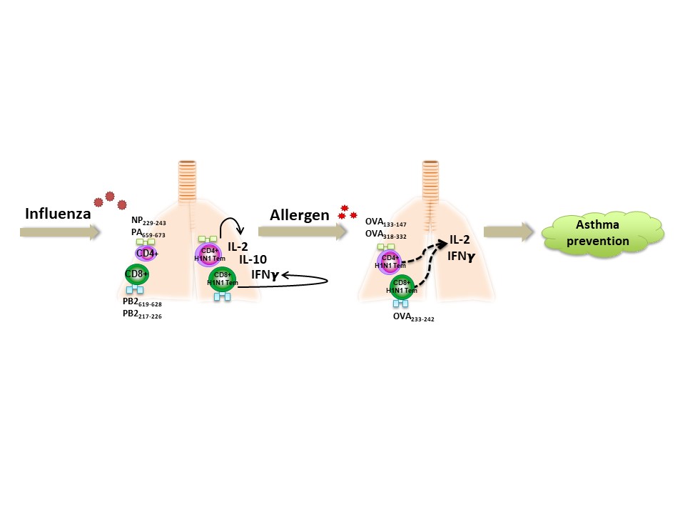 The hygiene hypothesis, which supports that a lack of bacterial contact early in life induces allergic TH2 immune responses, is the leading concept to explain the current asthma epidemic. Our research showed for the first time, that heterologous immunity (HI) against influenza virus may also protect from asthma development (Fig. 1).