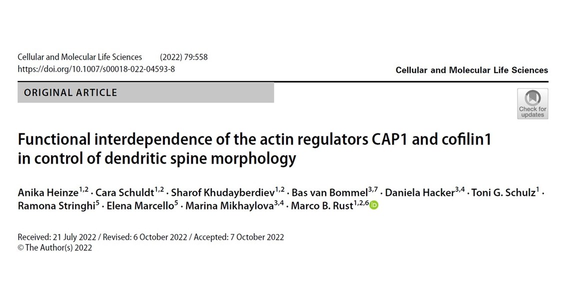 Heinze A, Schuldt C, Khudayberdiev S, van Bommel B, Hacker D, Schulz TG, Stringhi R, Marcello E, Mikhaylova M, Rust MB (2022). Functional interdependence of the actin regulators CAP1 and cofilin1 in control of dendritic spine morphology. Cell Mol Life Sci 79(11):558.