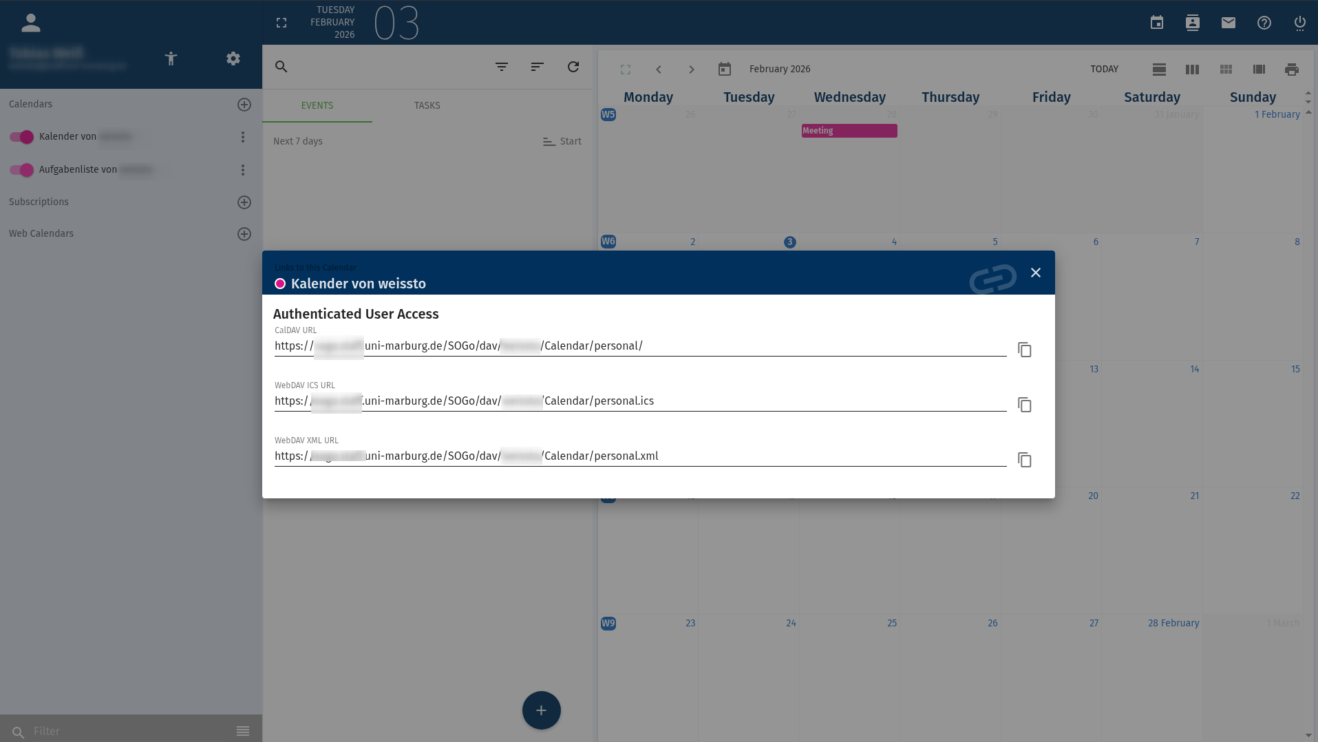 Now enter your account details. The server path must be the end of the path labeled "CalDAV account address" in webmail (without "https://home.students.uni-marburg.de"), which can be found in webmail by clicking the three dots next to the respective calendar under "Links to this calendar".
