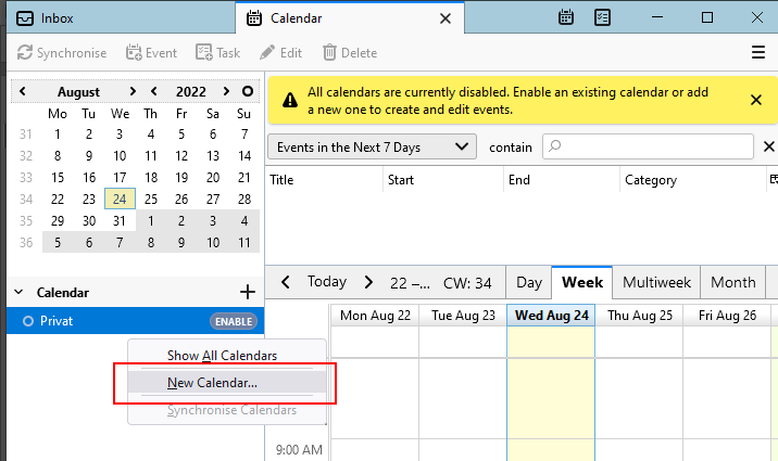 Right-click in an empty area in the left-hand column to open the context menu. Select "New Calendar...".