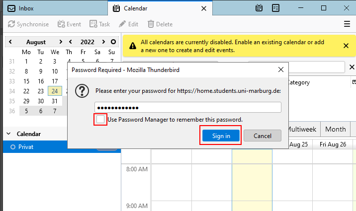 Thunderbird has a bug. Later you get a loop in the password prompt. In addition, Thunderbird's password management is insecure!